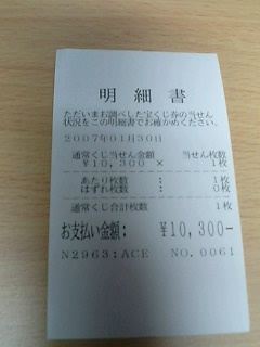 12月に買っていた年末ジャンボ宝くじ!あたってしまいました マヂウレ━━(*´∀`*b)━━シィ!!!! 初めてです げらげら o(^▽^)o げらげら 過去において、「(10万円くらいですが)おしい~~~(TwTlll)ガーン 」というときがありました ( ̄ー ̄)ニヤリッ そこで宝くじ対策を考えましたヽ(*’-^*)。 極意その1「○○の宝くじ売り場で買うときは、売り出してからの第2土・日曜日をねらえ(ノ≧∀≦)ノ・‥…━━━★ ピキューン!」極意その2「○○の宝くじ売り場は買う人が少ないのに当たりがよく出ている。そこで買う(ノ≧∀≦)ノ・‥…━━━★ ピキューン! 」です。何とか当たりました(;≧∇≦) =3 ホッ といっても、1万円ですが (*^-^*) ニッコリ☆人気blogランキングへ!ココをクリック!