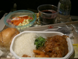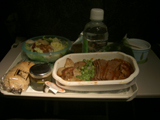 1:37、やっと機内の席に座ることができた。 2:13離陸。しかし、客室乗務員から変な話しがあった。 それは「席の隣は非常口になっている。冷たい空気が入り込んでくる恐れがあるのでブランケットを渡しておく」というものだった。 それはちょっとデインジャーな話しではないか! しかも、元々席にブランケットがあるから2枚もあっても邪魔になる。 しかし、それは・・・本当だった。 3:00に機内食(写真)が配られたが、そのとき赤ワインを注文。 それも大きな誤算であった。それは酔いが覚めてきたときに、非常口から冷たい空気が入ってきた。 また、機内は南半球に向かうということから、暖房ではなく少々の冷房状態になっていた。もう寒くて仕方がない。席を替わりたいが満席状態。 「これはたまらん。風邪をひいてしまう」・・・ 7:50機内食(写真)を配ってきたので、起きるのであった。そのとき、予想通り・・・風邪をひいていた。人気blogランキングへ!ココをクリック!