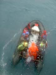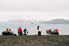 16:15、【Pendlum Cove】から上陸するというので、すぐに着替える。 16:40,ゾディアックボートに乗り込む。 上陸しても、見渡す限り石や砂ばかりの浜辺。みんな山の方へ向かっている。「つまらないが、付いていこう」よいしょ、よいしょ・・・残雪がある。 「一体、何故山へ向かうのか!?」やっとたどり着いた。そこは、カルデラ地形の山だった。人気blogランキングへ!ココをクリック!bogランキングへ!ココをクリック!