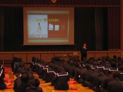 今日は、南極にいた話しを2年生全員を体育館入れて授業(お話し)をしました。 授業のタイトルは 『南極ラブストリー』(^_^)v 生徒から「何で、ラブストリー???」「南極に行って、浮気したん?(「したの?」という意味)そこでこういいました。(^o^) 「南極が好きになったから‘ラブ’なんです!」と・・・(^O^) 今回の授業は、できるだけ映像を見てもらった方がいいだろうと思いました。というのも、普段の授業では話しはいくらでもできるが、ビデオや写真はなかなか見せることができないからです(特にビデオは! (^o^) ) しかし、ハプニングが起こりました。実は、昨日ちゃんとスクリーンに映るかどうかプロジェクターを確認したのですが、今日4時限目終了後に体育館で準備をしていたのですが、スクリーンに映らないのです。」(*_*) とりあえず、給食が終わってからもう一度やってみたもののできませんでした。仕方なくその方に詳しい H先生に来てもらったのですが・・・「これはどちらを先に電源を入れたかで映ったり映らなかったりする!どちらを先に電源を入れましたか?」・・・ 確かに 昨日電源を入れたのはプロジェクターで次にパソコンだったが今日はその逆だった。しかし、困ったことが起こった。それは、ビデオがパワーポイントに貼り付けることができなかったので、昨日の晩 苦肉の策として ビデオをパソコンにつなげて直接映してやろうとしました。(といっても、ビデオはHDDなのでテープより簡単にパソコンには画像が取り込みやすいいのですが・・・) 大きな理由としては、ビデオの映像をDVDにこぴーしても認識してくれない。パソコンに取り込んだら、容量が多き過ぎるため拒否されるのです。 それを午前中の休み時間、必死こいでやっていました。(今日の午前中は全部授業があったので休み時間にしかできなかったのです)しかし、一端この場になってパソコンの電源を切ると言うことは画像を取り込む必要がある。しかし、13時30分授業が始まる。・・・仕方がない行き当たりばったりで行こう(>_