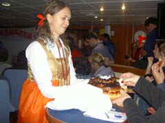 18:30、明日のスケジュールの説明。 終わりに、「カメラを持って来るように!」ということらしい(R・Nさんに教えてもらった)のでとりあえずはデジカメを持って行く。何にかあるのかな!!?? スケジュールの説明が終わった後、「今から、ロシアンダンスショーを始めます!」というのである。「ダイニングルームのウエイトレスやベッドメーキングの係員のほとんどがロシア人だが・・・」と思っていると、大きなパンを持ってきた。それをみんなそれぞれちぎって食べ始める。自分とところに来たとき、わりかし(「割合」という意味)大聞くパンをちぎって食べた!すると「しょっぱい!!」ロシアのパンは塩を振りかけてあったのだ!「たくさん取りすぎた!」と思ったが、全部食べた。 写真はパンを持ってきたところ 続いて、民族衣装にまとってダンスが始まる。とにかくグルグル回る。グルグルグル・・・そして、ウエイトレス、スタッフ、観光客が一緒になって手を取り合ってダンス!これは楽しかった!よかった!何というダンスだ!人気blogランキングへ!ココをクリック!bogランキングへ!ココをクリック!