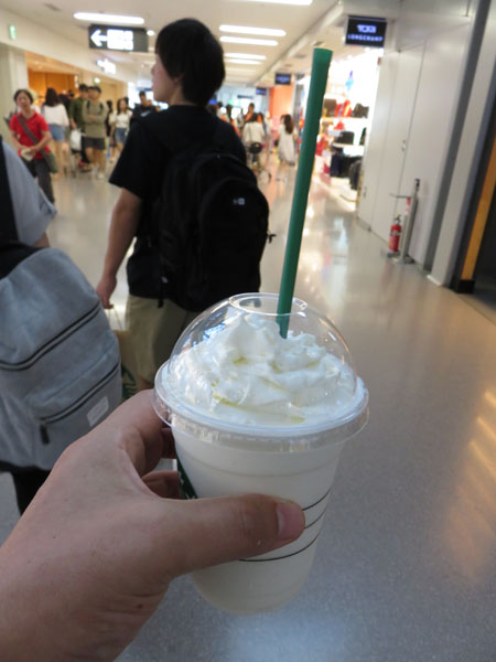 出国手続き後、昼食もとっていないのでスターバックスでちょっと腹ごしらえをする。コーヒーを飲んだら寝られなくなるので、自分は「バニラ クリーム フラペチーノ」を購入する。家人はアイスコーヒーにパンのようなもの、息子は抹茶 クリーム フラペチーノにパンのようなものを購入する(1641円)