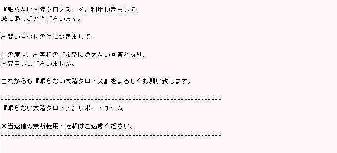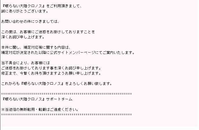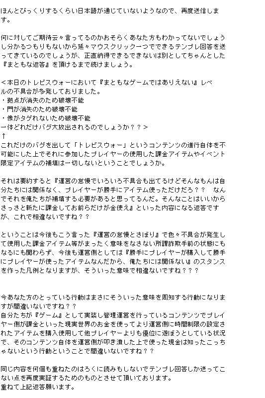 えっと・・・、確か前回はTWのバグに対してモンスター出現がしなくなった云々かんぬん送ってきたのと、ペットのリネームバグに対していつもの 「貴重なご意見(貴重とは言ってない)ありg(ry の辺りまでUPしてたと思いますがまずはTWバグに関して結局なんの返答ももらえていなかったため追撃をば・・・