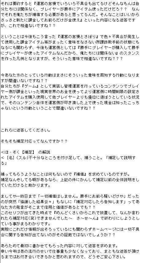 さすがに自身もいろいろ納得出来ない部分が積み重なっていたため、少々言葉汚くなりましたが最低限の 『不具合の修正』 『不具合により行使できなかったアイテムの補填