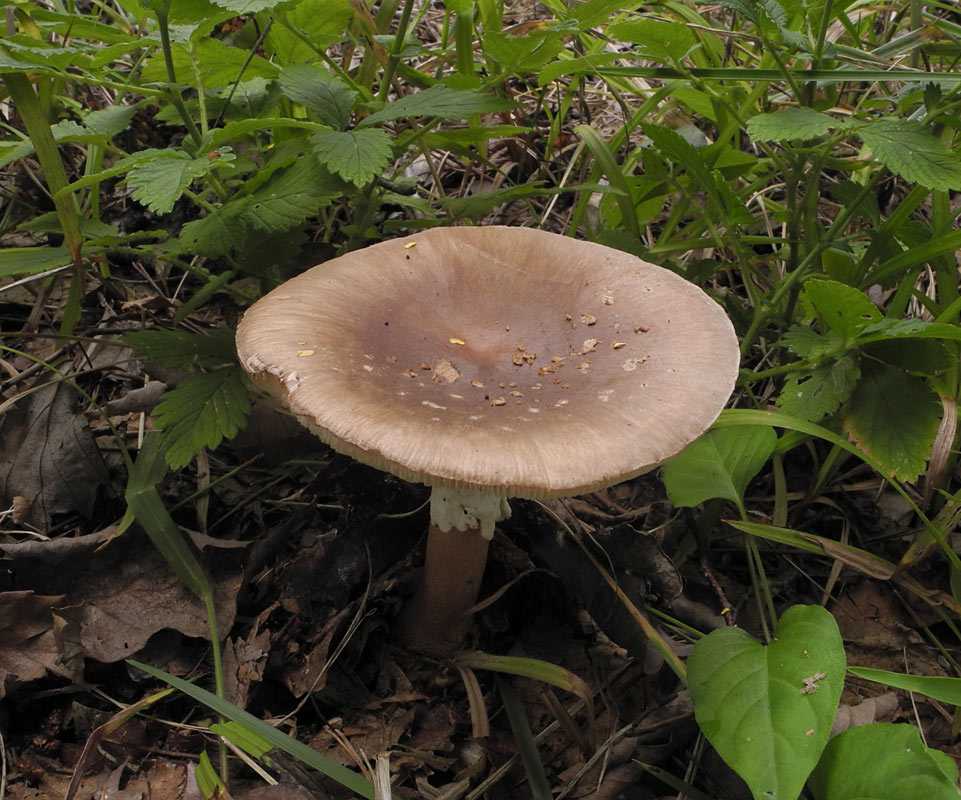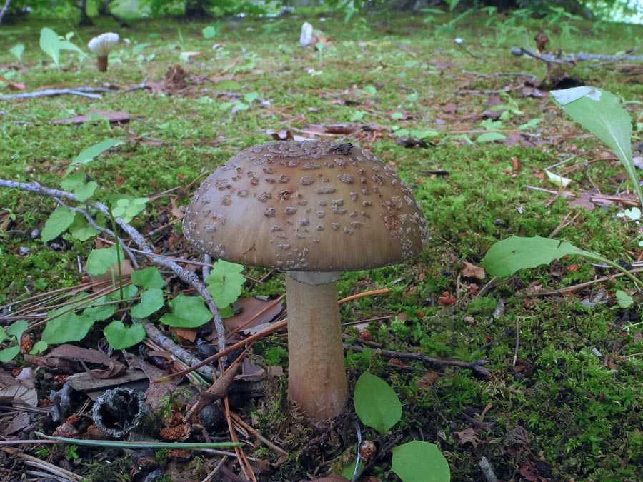 夏~秋、林内の地上に発生。中型。傘は赤褐色で多数のいぼを付着。ひだは白色、のち赤褐色のしみ。柄の根元は膨らみ、つぼの破片が環状に付着。肉は傷つくと次第に赤褐色に変色する。食。生食は毒。