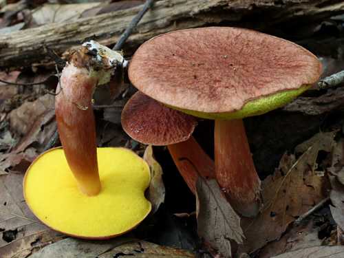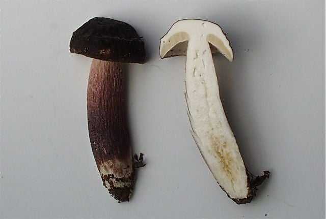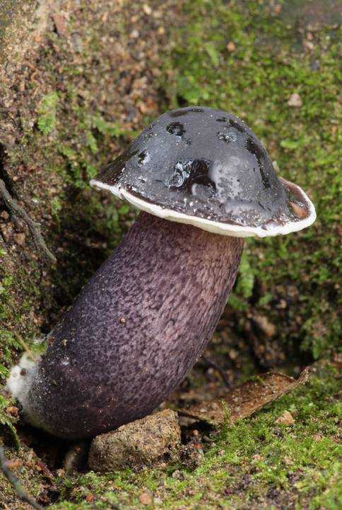 外見的特徴はムラサキヤマドリタケとほぼ似ているが、柄が暗紫色でありながら、明瞭な編み目がない。