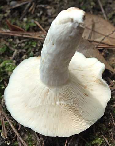 傘は初めまんじゅう形で開くと浅いじょうご形になり、表面の色は白色。きのこが古くなると汚黄色に変わる。ひだは白色で傘と同様古くなると褐色のしみを生ずる。 並び方は密で柄に直生する。柄は傘とほぼ同色で傷つけると黄褐色に変色する。