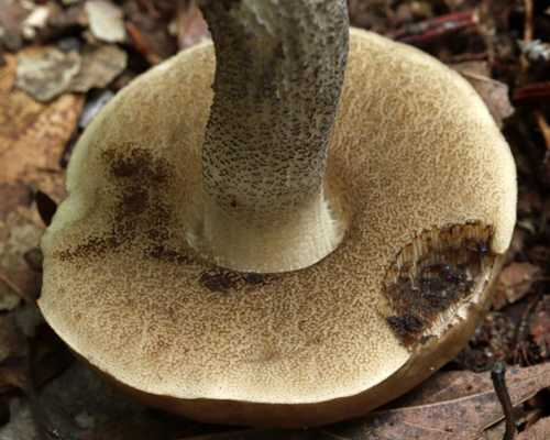 柄は表面頂部は白色で幼菌時は帯褐紫色が下方ほど濃く、成熟につれて上部が赤紫色から黄土褐色となり黄土斑紋を生じ全面に細い編み目が覆う。