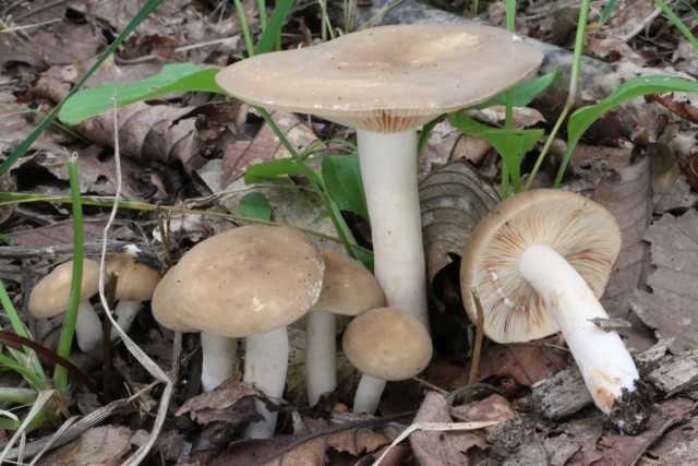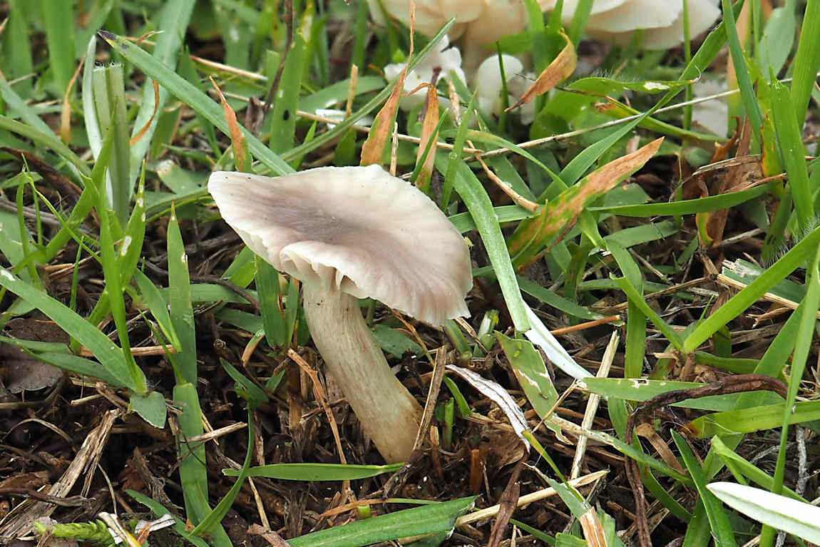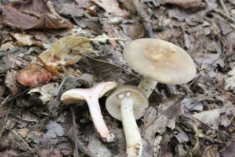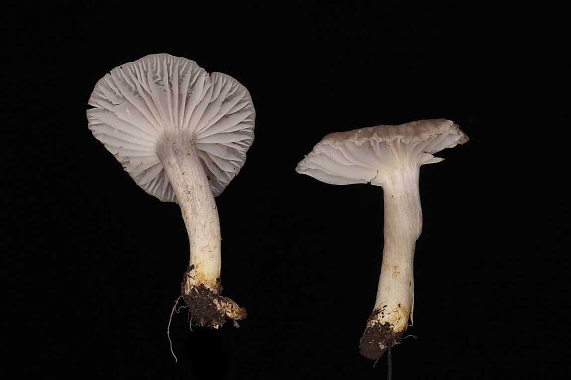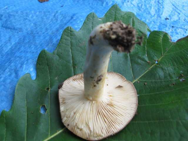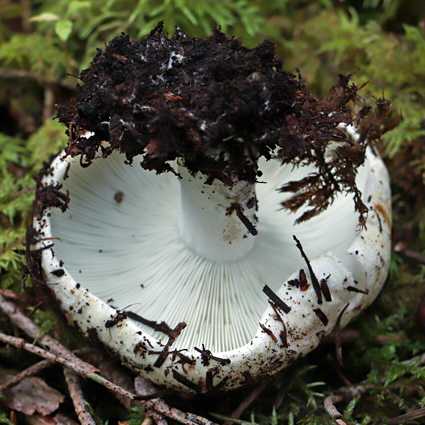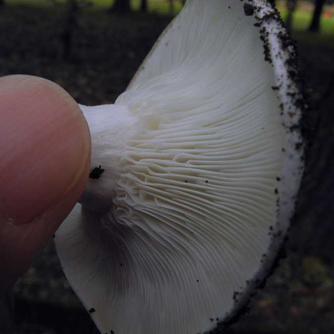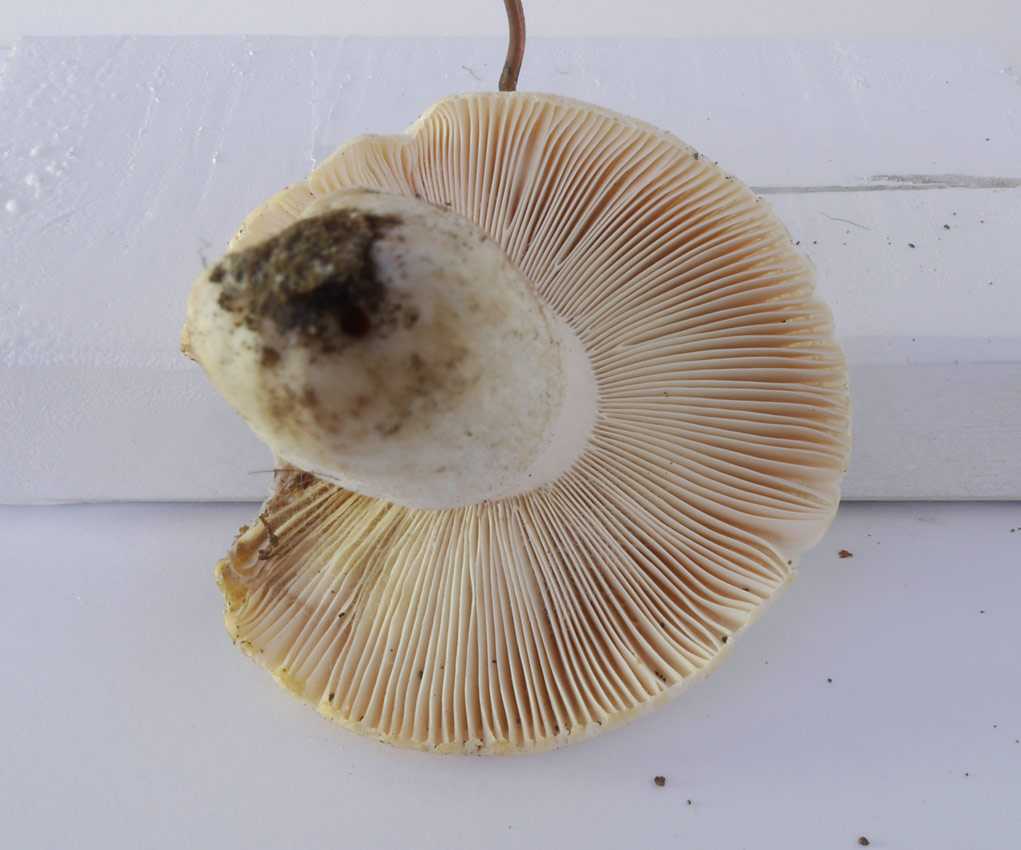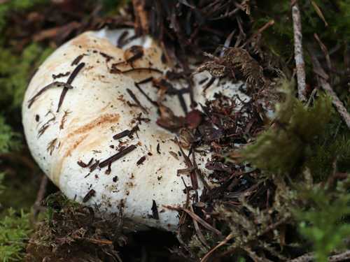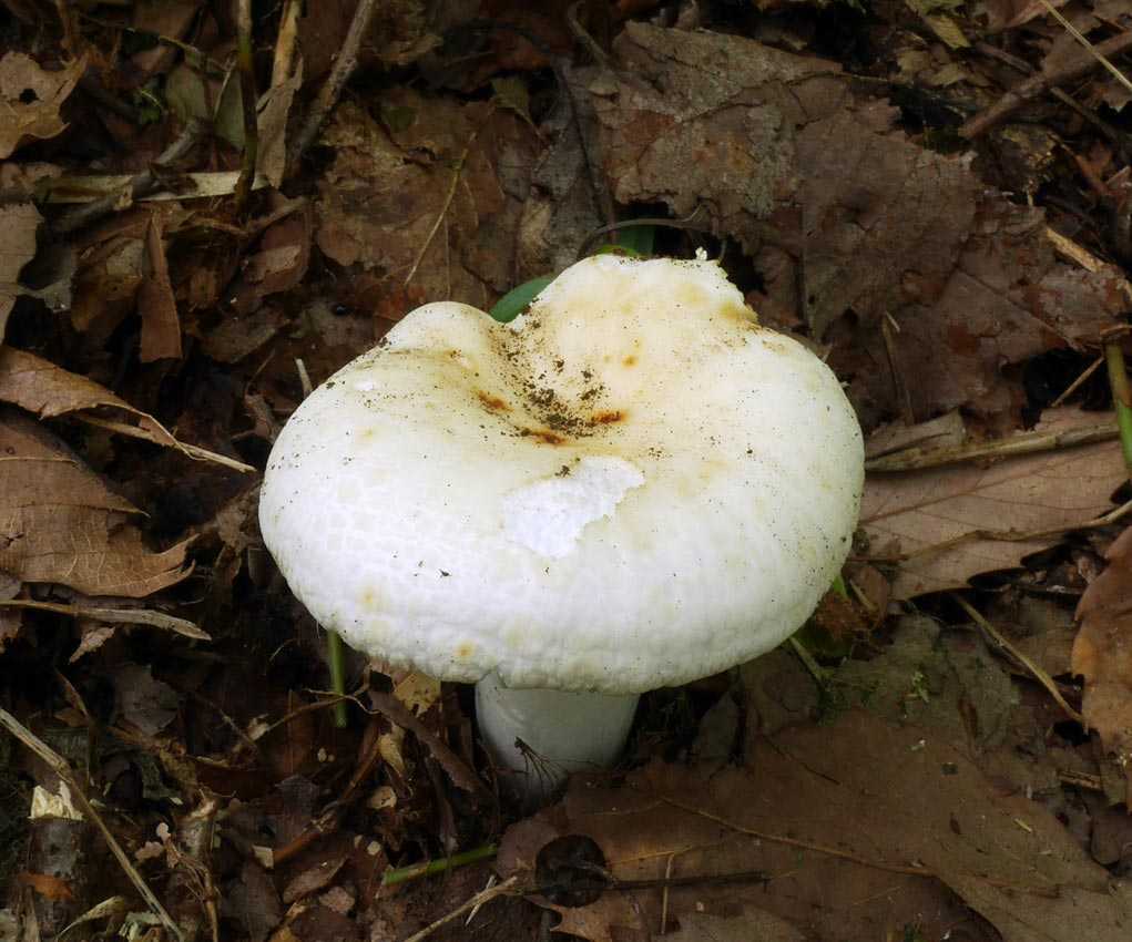 形状はシロハツやクロハツのような典型的な大型ベニタケと言った感じ。 幼菌時は傘の周囲が内側に巻き、中央が凹んだまんじゅう形ですが、後に浅い 漏斗形 に開きます。 傘は全体的に 純白 ですが、部分的に褐色になるようです。ただの汚れかもですが。