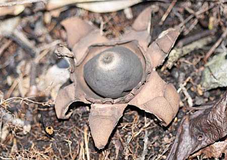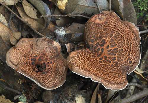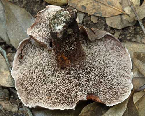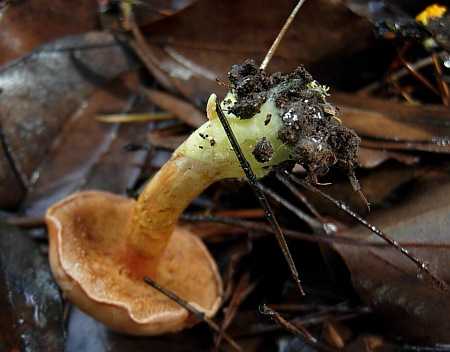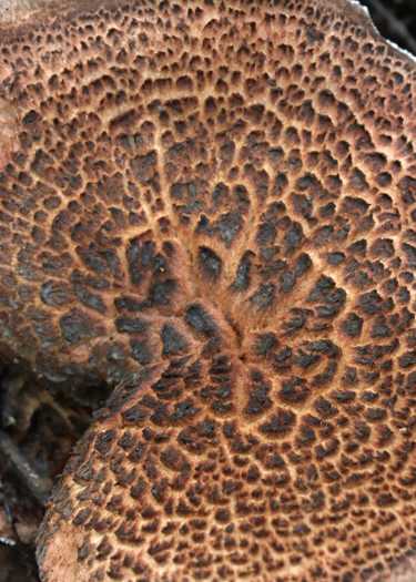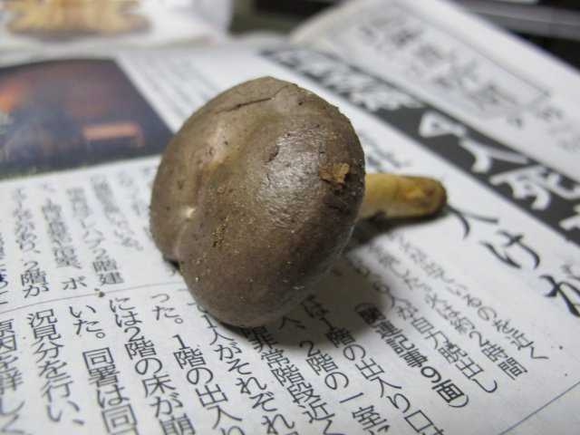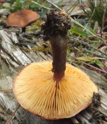 傘表面は黒褐色~暗黄褐色で、縁部永く内巻、表面乾性微粉状で、しばし中央部が窪む。