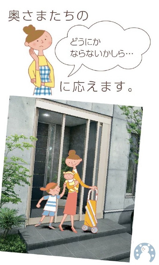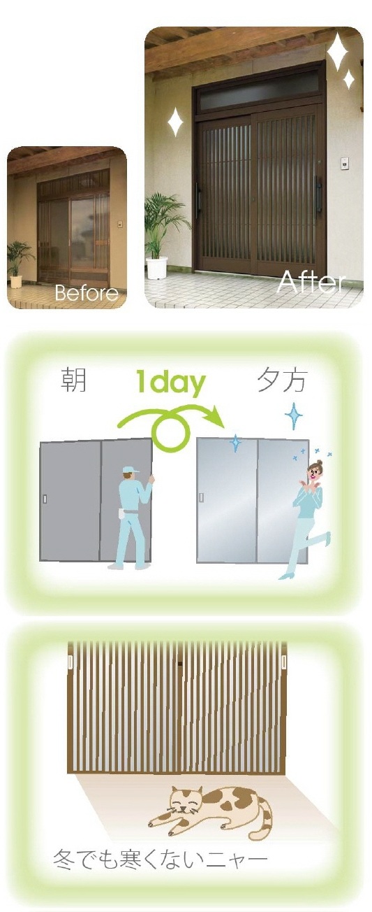 玄関リフォームは、富山県内全域に対応します。 富山県西部:高岡市、射水市、氷見市、小矢部市、砺波市、南砺市富山県東部:富山市、滑川市、中新川郡、魚津市、黒部市、下新川郡 貴方の大事な住まい、もっと快適にしませんかたった1日でデキるんです「窓や玄関のリフォームって大変」とお考えではありませんか。実はリフォーム工事は、それほど時間もかからず、手軽で簡単。窓の節電改修(エコ内窓の設置)なら20分程度。玄関のリフォームでも半日から1日程度で完了します。もちろん、品質も確かで安心です。より快適な住まいへ、リフォームしてみませんか。 YKK AP 玄関引戸 Japanese Style Sliding Doorスライド機構の玄関引戸は、設置する場所を選びません。たとえば駐車スペースとアプローチを兼用したり、階上に玄関を設けたり、また、開閉もしやすいのでバリアフリー設計にも最適です。広いスペースではもちろん、限られたスペースでの設計の自由度を大きく高めます。 【工事の流れ】1.事前の打合せ。大きさや種類を確認。2.工事開始。古い玄関引戸を撤去して、新しい断熱玄関引戸を設置。3.シーリング・建付調整・チェックを行い工事完了。 【工事期間】 約1日。 現場確認、見積りは無料まずはお電話ください 24時間受付 0120-375-345アルミ建材和田 〒933-0062 富山県高岡市江尻856-2 納得の徹底対抗 かならず他店より安くしますぜひ、ご相談ください (社)日本サッシ協会加盟店(社)カーテンウォール・防火開口部協会加盟店 スタッフは、富山県の建築組合員です。建築組合では、市や町のご協力のもと「無料の住宅相談所」を開設しています。新築・増改築はもちろん住宅診断までお気軽にご相談ください。