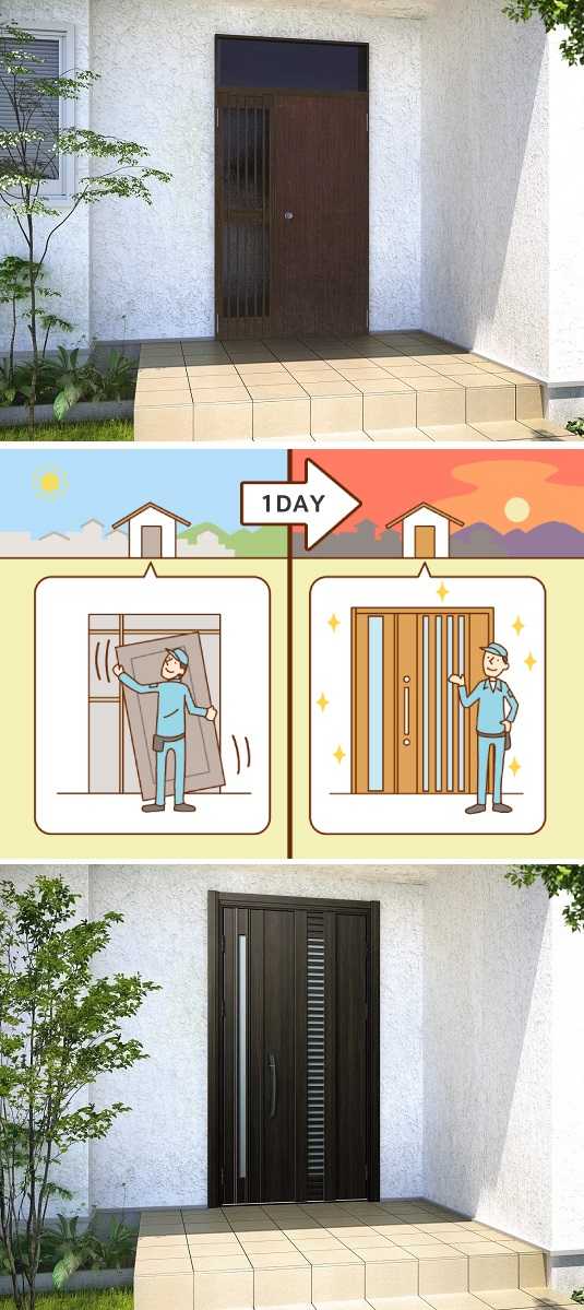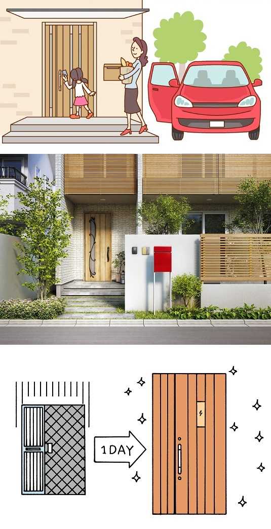 ≫現場確認、見積りは無料≪玄関ドア修繕、断熱玄関ドアへの交換は、富山県内全域に対応します。富山県西部:高岡市、射水市、氷見市、小矢部市、砺波市、南砺市富山県東部:富山市、滑川市、中新川郡、魚津市、黒部市、下新川郡 いい製品を、どこよりも安く! 「玄関ドアのガラスが割れた」、「玄関ドアのカギ(ハンドル錠)が壊れた」、「もっと明るく暖かい玄関にしたい」、「玄関ドアの防犯面をよくしたい。家族を守りたい」、「さわやかな自然の風を取り入れることができる玄関にしたい」、「玄関が冷蔵庫みたいに寒い」、「最新のスマート ドアに、交換したい」など、玄関ドアの修理から、ニーズに対応した玄関のリフォーム工事まで、玄関まわりのことなら何でもお任せください。 YKK AP スマートドア ヴェナート 「スマートコントロールキー」を搭載したバリエーション豊富な断熱玄関ドア。毎日使う玄関ドアをもっと便利に快適にするために誕生したのがスマートドア ヴェナートです。キーレスでカギの開け閉めができる「スマートコントロールキー」を搭載。カギ穴を見せない構造で、高い防犯性も確保しました。YKK AP 断熱玄関ドア ヴェナート快適で上質な毎日へ。あなたらしい玄関ドアを見つけてください。玄関ドアは、顔、心、表現。家族を守り、そして自分らしさを示すシンボルにもなります。細部までこだわりぬいた重厚なドアからシンプルなドアまで、豊富なデザインがそろった玄関ドア「ヴェナート」。あなたにふさわしいデザインを、質感を、色合いを見つけてください。きっと、より快適で上質な毎日がはじまります。YKK AP 高断熱玄関ドア イノベスト業界トップクラスの断熱性を実現した、住まいを快適にする玄関ドア。断熱性、意匠性、使い心地、すべてにおいてハイクオリティをめざして誕生した高断熱玄関ドア イノベスト。上質素材にこだわり最上クラスの断熱性を誇るD70、豊富なデザイン・バリエーションのD50の2タイプをご用意しています。YKK AP スマートドア プロント人気の木目柄を新たにラインアップし、エクステリアとトータルコーディネイトができるようになりました。「スマートコントロールキー」を搭載しているため、ドアの開け閉めはリモコンやカードでサッと行うことができます。もっと快適にしませんか?「玄関のリフォームって大変」とお考えではありませんか。実はリフォーム工事は、それほど時間もかからず、手軽で簡単。玄関のリフォームは、半日から1日程度で完了します。もちろん、品質も確かで安心です。より快適な住まいへ、リフォームしてみませんか。 ≫施工実績トップクラス・創業45周年≪ 【工事の流れ】1.事前の打合せ。大きさや種類を確認。2.工事開始。古いドアを最新の断熱玄関ドアへ交換。3.シーリング・建付調整・チェックを行い工事完了。【工事期間】 半日~1日。見積りは無料!まずはお電話ください! 24時間受付 0120-375-345アルミ建材和田 富山県高岡市江尻856-2 【価格保証】徹底的に価格競争します!◇富山県の気候風土に適した快適で丈夫なリフォームから耐震補強工事まで住まいのことなら何でも、お気軽にご相談ください。(社)日本サッシ協会加盟店(社)カーテンウォール・防火開口部協会加盟店 【富山県西部:営業エリア】高岡市、射水市、氷見市、小矢部市、砺波市、南砺市【富山県東部:営業エリア】富山市、滑川市、中新川郡、魚津市、黒部市、下新川郡 【所在地】高岡市江尻856-2 Tel 0120-375-345 【取扱メーカー】三協アルミ、YKK AP、リクシル、AGC、美和ロック、3M来店不要!電話で、24時間受付中!