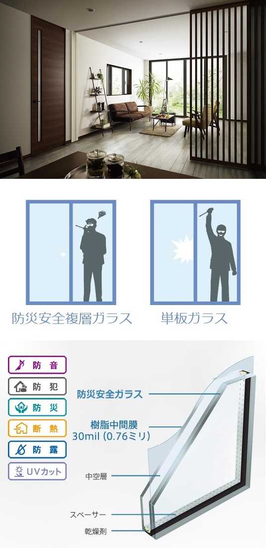 ≫現場確認、見積りは無料≪防災安全複層ガラスへの交換は富山県内全域に対応します。富山県西部:高岡市、射水市、氷見市、小矢部市、砺波市、南砺市富山県東部:富山市、滑川市、中新川郡、魚津市、黒部市、下新川郡 いい製品を、どこよりも安く! 「窓ガラスが割れた」、「エコ内窓のカギ(クレセント錠)が壊れた」、「防犯ガラスに交換したい」、「高性能トリプルガラス樹脂窓に興味がある」など、窓ガラスの修理から、ニーズに対応した窓まわりの防犯対策まで、窓まわりのことなら何でもお任せください。窓の専門店です。 YKK AP 防災安全複層ガラスガラスの間に強度と柔軟性に優れた中間膜を挟み、加熱・圧着加工を施した「合わせガラス」を用いた、防犯タイプの複層ガラス。一般複層ガラスよりも破壊されにくい構造で、日本の住宅侵入手口に多い「こじ破り」対策にも大変効果的で、官民合同会議の定める「防犯性能の高い建物部品」として認定されています。遮熱性能や断熱性能の高いLoe-E複層ガラスとも組合せ可能です。≫施工実績トップクラス・創業46周年≪【工事の流れ】1.事前の打合せ。大きさや種類を確認。2.工事開始。防災安全複層ガラスへ交換。3.建付調整・チェックを行い工事完了。【工事時間】 約1時間。 見積りは無料!まずはお電話ください! 24時間受付 0120-375-345アルミ建材和田 富山県高岡市江尻856-2【価格保証】徹底的に価格競争します!◇富山県の気候風土に適した丈夫で快適なリフォームから耐震補強工事まで住まいのことなら何でも、お気軽にご相談ください。 (社)日本サッシ協会加盟店(社)カーテンウォール・防火開口部協会加盟店 【富山県西部:営業エリア】高岡市、射水市、氷見市、小矢部市、砺波市、南砺市【富山県東部:営業エリア】富山市、滑川市、中新川郡、魚津市、黒部市、下新川郡【所在地】高岡市江尻856-2 Tel 0120-375-345【取扱メーカー】三協アルミ、YKK AP、リクシル、AGC、美和ロック、3M来店不要!電話で、24時間受付中!