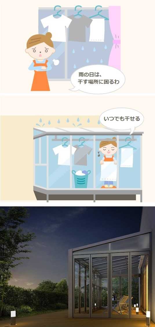 ≫現場確認、見積りは無料≪サンルーム修理、サンルーム新設工事は、富山県内全域に対応します。富山県東部:富山市、滑川市、中新川郡、魚津市、黒部市、下新川郡富山県西部:高岡市、射水市、氷見市、小矢部市、砺波市、南砺市 いい製品を、どこよりも安く! 「サンルームの屋根が壊れた」、「サンルームのガラスが割れた」、「突然の雨や花粉の心配があっても、洗濯物を干したまま安心して外出したい」、「ペットとの時間や充実した余暇を楽しむ空間として、サンルームがほしい」など、サンルームの修理から、リフォームニーズに対応したサンルームの新設工事まで、サンルームのことなら何でもお任せください。エクステリア工事の専門店です。YKK AP ソラリア テラス囲い雨の多い季節や花粉など洗濯物の外干しも「ソラリア」なら安心。庭まわりの使い心地をさらにアップ。いつでも『干せる』、いろいろ『しまえる』快適空間。バージョンアップしたテラス囲い・バルコニー囲いです。屋根やクレセントを新しくするなど、快適性能にこだわりました。サンルームの多目的(ガーデンルーム、洗濯物干し場)なニーズにきめ細かく対応します。サンルームとして、洗濯物干し場の利便性を高める製品が充実。 ≫施工実績トップクラス・創業47周年≪ 【工事の流れ】1.事前の打合せ。大さや種類を確認。2.工事開始。サンルームを設置。3.シーリング・建付調整・チェックを行い工事完了。【工事期間】 約1日。 見積りは無料!まずはお電話ください! 24時間受付 0120-375-345アルミ建材和田 富山県高岡市江尻856-2【価格保証】徹底的に価格競争します!◇富山県の気候風土に適した丈夫で快適なリフォームから耐震補強工事まで住まいのことなら何でも、お気軽にご相談ください。(社)日本サッシ協会加盟店(社)カーテンウォール・防火開口部協会加盟店【富山県西部:営業エリア】高岡市、射水市、氷見市、小矢部市、砺波市、南砺市【富山県東部:営業エリア】富山市、滑川市、中新川郡、魚津市、黒部市、下新川郡 【所在地】高岡市江尻856-2 Tel 0120-375-345 【取扱メーカー】三協アルミ、YKK AP、リクシル、AGC、美和ロック、3M来店不要!電話で、24時間受付中!
