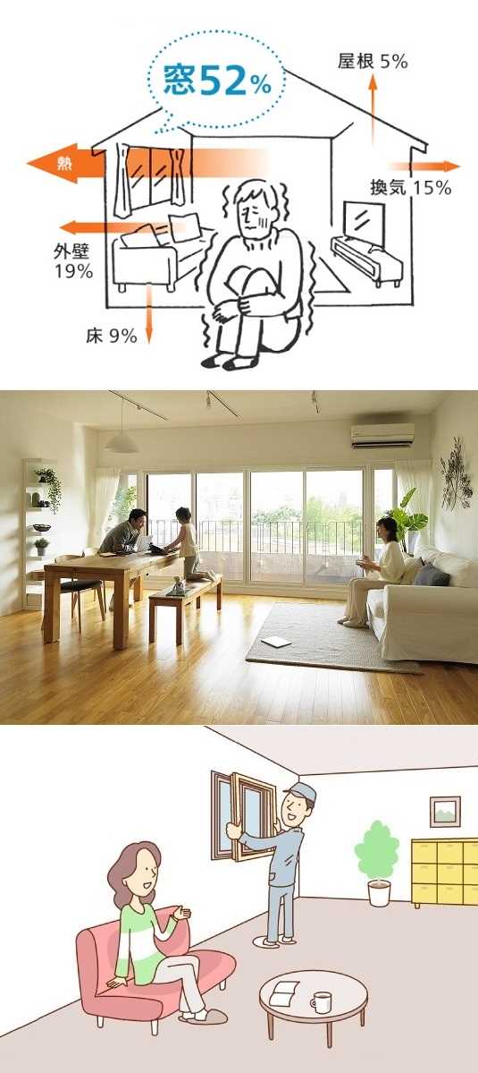 ≫現場確認、見積りは無料≪エコ内窓の修理、エコ内窓の後付けは、富山県内全域に対応します。富山県西部:高岡市、射水市、氷見市、小矢部市、砺波市、南砺市富山県東部:富山市、滑川市、中新川郡、魚津市、黒部市、下新川郡 いい製品を、どこよりも安く! 「エコ内窓のガラスが割れた」、「エコ内窓のカギが閉まりにくい」、「エコ内窓で防音したい」、「エアコンの効きを良くして、もっと節電したい」など、エコ内窓の修理から、ニーズに対応した窓のリフォーム工事まで、窓まわりのことなら何でもお任せください。窓の専門店です。"Smart&Eco"な生活スタイルみなさんの住まいでは、 冷暖房機器のパワーをいくら上げてもなかなか効果を感じない、ということはありませんか? 一般的な住まいでは、外壁や屋根のほか、 窓や扉などの開口部からも意外に多くの熱が出入りしています。住まいの断熱は、人が環境と共生しながら快適に暮らしていくうえで、とても大きなメリットがあります。これからの断熱キーワード?「窓」夏は外からの熱の侵入は、約 7 割が窓から、また、冬になると暖房熱の約 5 割が窓から流出します。 窓からの熱の侵入・流出を効果的に防ぐことで経済的で快適な暮らしをささえます。YKK AP エコ内窓 プラマードU今ある窓に内窓を取付けて二重窓に。「冬、窓辺が寒い」「夏、日差しが暑い」そんなお悩みは、かんたん内窓リフォームで解消。家族の快適で健康的な暮らしづくりに内窓プラマードUが効果を発揮。省エネ 冷暖房コストを節約でき、夏は涼しく冬は暖かく快適になります。快適 結露の発生を抑制します。気になる外の騒音対策にも有効です。安心 二重窓で侵入しにくく、防犯合わせガラスを組合せればさらに安心です。お手軽 わずか約60分で施工完了。マンションリフォームにも最適です。どこでも リビング、和室、洗面所から浴室まで窓のタイプに合せて取付け可能です。 寒い冬場、実は“ヒートショック”の危険がいっぱい!そんなときは「窓リフォーム」がおすすめです。 家の中の温度差を小さくすれば、日々の暮らしがもっと快適になります。家の中がぽかぽかに!内窓をつければ断熱性が高まり、冷たい外気の影響を受けにくくなります。結露も減ってすっきり!内窓をつければ冬でも窓が冷えにくくなり、結露の発生が抑えられます。暑い夏も過ごしやすい!「内窓+日よけ」で日射熱をカット。冷房効果も高まります。防音性もすごい!外からの音を15dB低減。騒音が半分以下に聞こえる遮音効果です。お部屋の印象も明るく!お好みの内窓カラーを選んで、窓まわりの印象を一新できます。「かんたん内窓リフォームで、さよなら、寒くて暑い家」≫施工実績トップクラス・創業47周年≪【工事の流れ】1.事前の打合せ。大きさや種類を確認。2.工事開始。窓の内側に内窓を設置。3.建付調整・チェックを行い工事完了。【工事時間】 約60分。見積りは無料!まずはお電話ください! 24時間受付 0120-375-345アルミ建材和田 富山県高岡市江尻856-2【価格保証】徹底的に価格競争します!◇富山県の気候風土に適した丈夫で快適なリフォームから耐震補強工事まで住まいのことなら何でも、お気軽にご相談ください。(社)日本サッシ協会加盟店(社)カーテンウォール・防火開口部協会加盟店【富山県西部:営業エリア】高岡市、射水市、氷見市、小矢部市、砺波市、南砺市【富山県東部:営業エリア】富山市、滑川市、中新川郡、魚津市、黒部市、下新川郡【所在地】高岡市江尻856-2 Tel 0120-375-345【取扱メーカー】三協アルミ、YKK AP、リクシル、AGC、美和ロック、3M来店不要!電話で、24時間受付中!