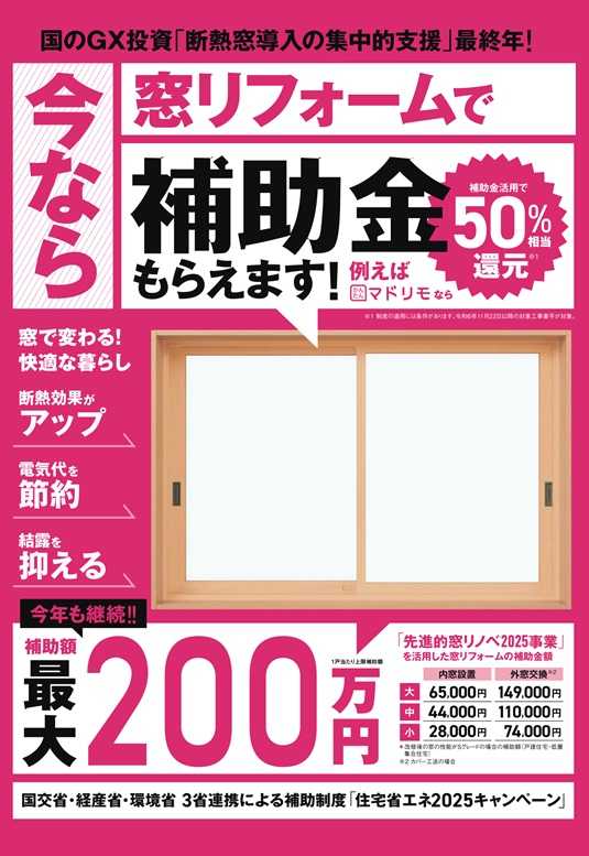 ≫現場確認、見積りは無料≪補助金の対象(断熱窓・内窓)工事は、富山県内全域に対応します。富山県西部:高岡市、射水市、氷見市、小矢部市、砺波市、南砺市富山県東部:富山市、滑川市、中新川郡、魚津市、黒部市、下新川郡いい製品をどこよりも安く!住宅省エネ2025キャンペーン(「国土交通省・経済産業省・環境省」3省連携による住宅の省エネ化支援強化策<補助制度>)住宅の省エネ化への支援強化に関する予算案を閣議決定!国土交通省・経済産業省・環境省が連携して取り組みます!~省エネ住宅の新築、住宅の省エネリフォームを支援する「子育てグリーン住宅支援事業」を創設します~2050年カーボンニュートラルの実現に向けて住宅の省エネ化の支援を強化するため、国土交通省及び環境省は、「ZEH水準を大きく上回る住宅(GX志向型住宅)」の新築や、子育て世帯等を対象とする長期優良住宅やZEH水準住宅の新築を支援する新たな補助制度を創設し、賃貸住宅も含めて幅広く支援します。また、国土交通省、経済産業省及び環境省は、住宅の省エネリフォーム等に関する補助制度をそれぞれ実施するとともに、各事業をワンストップで利用可能とするなど連携して支援を行います。また、国土交通省、経済産業省及び環境省は、住宅の省エネリフォーム等に関する補助制度をそれぞれ実施するとともに、各事業をワンストップで利用可能とするなど連携して支援を行います。【省エネ改修】高断熱窓の設置<断熱窓への改修促進等による住宅の省エネ・省CO2加速化支援事業【環境省】(令和6年度補正予算案 1,350億円)>〇補助金は、断熱改修工事を行う事業者の申請に基づき、住宅所有者に補助金全額が還元されることを条件に、当該事業者に対して交付。〇高断熱窓(熱貫流率Uw1.9以下等、建材トップランナー制度2030年目標水準値を超えるもの等、一定の基準を満たすもの)への断熱改修工事に対して支援。〇工事内容に応じて定額を交付。(補助率1/2相当等。1戸あたり最大200万円。) (注)申請は、住宅所有者等(一般消費者)のために、アルミ建材和田が行います。※本事業の内容は変更される場合もございます。また掲載内容は概要であり、より詳細な条件などが定められている場合もございますので、ご利用にあたっては環境省ホームページにて必ずご確認ください。≫まずは無料で問合せ見積り依頼を≪アルミ建材和田がお客さまに選ばれる3つのポイントPOINT1:地域に根差した専門店POINT2:安心の施工実績POINT3:高いお客さま満足度≫施工実績トップクラス創業50周年≪富山県の気候風土に適した「安心」「納得」のリフォームでお客さまの快適な暮らしを実現します。住まいのことなら何でもお気軽にご相談ください。「診断力」「提案力」が解決いたします。YKKAP マドリモ 断熱窓窓がかわると、暮らしが変わる。半日の窓リフォームで住まいの暑さ寒さを解決。壁工事不要のカバー工法で、窓をスピード交換。暑さ寒さの原因となっていた古い窓を、新築にも使われている最新の窓にかえて、より快適で健康、ローエネな暮らしにかえることができます。1窓あたり約半日でリフォーム完了。今ある窓枠に新しい窓枠をかぶせて取付けるカバー工法。壁を壊さず、住みながら最新の断熱窓へリフォームできます。窓がかわると、部屋全体が暖かく。断熱性が低い窓は外の寒さの影響を受けやすく、窓辺がひんやり。熱を伝えにくい樹脂窓にかえれば、冬でも室内側が冷たくなりにくく、部屋全体を暖かく保てます。自然換気を、より多く。開かない窓を開く窓に変えることも可能です。また引違い窓で風が入りにくい場合、「ウインドキャッチ連窓」に交換すれば、横からの風も効果的にキャッチし、一つの窓で風の入口と出口をつくることで換気量を増やすことができます。YKKAP マドリモ 内窓かんたん内窓リフォームでさよなら、寒くて暑い家。今ある窓に内窓を取付けて二重窓に。窓の断熱性を高め、住まいの暑さ寒さのお悩みを解消できます。室外からの騒音対策にも効果的です。1窓あたり約60分でリフォーム完了。戸建もマンションも暖かく。今ある窓の内側に内窓を取付けるだけで、断熱性をアップし、寒さ暑さのお悩みを解消。マンションでも、設置位置は専有部なので戸別のリフォームが可能です。断熱効果のヒミツは「空気」と「樹脂」。今ある窓と内窓の間に空気層ができることで、冷たい外気の影響を受けにくくなります。熱を伝えにくい樹脂のフレームが、さらに断熱効果を高めます。室内側が冷たくなりにくいので、結露の発生も抑えられます。騒音も減って、お部屋が静かに。外からの音を15dB低減。騒音が半分以下に聞こえる防音効果です(人間の耳は、10dB下がれば、音が約半分に減ったように感じると言われています)。何度でも徹底的に価格競争します!必ず他社より安くなります!大切な「すまい」も「くらし」もゆたかにグレードアップ。選ぶのはお客さまです。お客さまの暮らしをより快適にするプランを