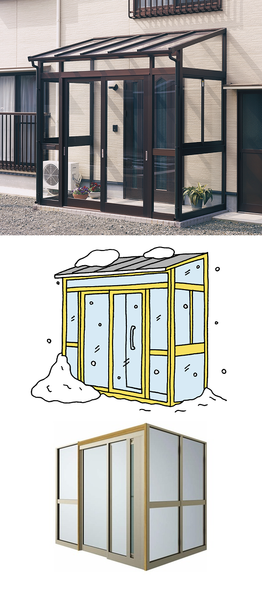「風除室のガラスが割れた」「風除室の引戸のカギが壊れた」「玄関から雨や雪などが吹き込んで出入りに困る。風除室がほしい」「子供のベビーカーや三輪車って玄関に置いとくとジャマよね。風除室にしたい」「玄関を囲えば宅配便で届いた荷物が大きかったり数が多いとき置き場所にできる」「玄関が寒い。玄関前を囲って風除室にしたい」など、風除室の修理から、リフォームニーズに対応した風除室の工事まで、​囲い工事のことなら何でもお任せください。エクステリア工事の専門店です。