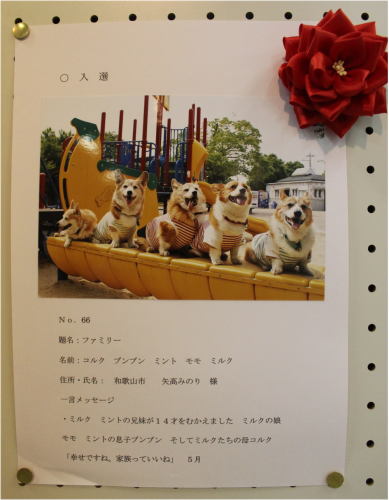 9月22日動物ふれあいフォトコンテストで、みのりんの写真が入賞しました。 それがこの写真。ミルクもミントも笑っている。 ふたりからの笑顔の贈り物のような気がして、表彰式に出席することにしました。3連休の白浜方面で大渋滞…結局式典には間に合わなかったけど、コルクとブンブン、ミントの分まで笑顔を振りまきましたうちにもコーギーいるのよ、長生きにあやかりたいわぁ~ってコルクをなでなで車椅子で頑張るブンブンを3人兄弟とママが会場で応援してくれたよ。やぎさんとも遭遇会場の前の浜の公園で会った、おばあちゃんとお孫ちゃんたちもなでなでしてくれた。ちょっと暑かったけど、と~さんとみのりんと一緒にミントのいない初めてのお出かけは、私たちへの笑顔のプレゼントでした。