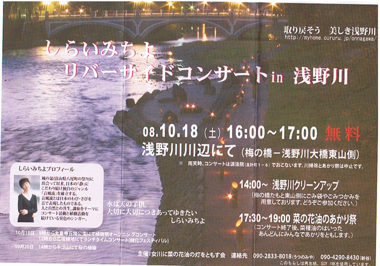 しらいみちよさんのレクイエムロード音楽祭に行ってきましたコンサートではなく音楽祭という所がしらいさんらしいです。しらいさんの記事はこちら日頃頑張っている嫁さんの慰労をかねて食事とコンサートに誘いましたがあいにくお手入れが入り一人で行きました。場所は金沢21世紀美術館シアター21初めて入りましたがエレベーターとか斬新ですね。受付するとエコバッグが貰える所がしらいさんらしいです。石川部会でムササビ募金をしたので「うつのみやちか」さんに13634円を寄付を手渡す初めてお逢いしたのにタカタさんですねと言われて驚きましたブログを見てくれたからかな??ムササビ募金についてはこちら毎日新聞記事はこちらシアター21はこじんまりとしていますが良い会場でした。遠慮がちに最後尾の席のハジに座りました。後方にはスタッフらしきお洒落な外人さんがビデオの準備しらいさんのオリエンタルな魅力にはまったのかな?!知り合いのご夫婦やお世話になってる奥さんも来場まずはオリジナルの3曲から希望、想春、たんぽぽ印象に残ったのは次の風、パーカッションが格好良いのとしらいさんの鳥のサエズリの真似と振り付けのインド風がいとをかしここからは長坂台スーパーキッズの登場!去年競演したらしい。中には大人びた小学生も?!童謡の減少をしらいさんも嘆いていました。春の小川夏はきぬ赤トンボふるさとは皆で合唱ふるさとと聴いて皆さんは何を想像しますか?の問いに殆ど田園風景や山、チャンバラした思い出など答えていました。長坂台スーパーキッズにチャンバラした事ある?と聞くと馬鹿にして「しなぁ~ぁい」との事そうなんだと意外な私もしかしたらこの世代はスタウォーズの方が印象あるかも?MCでは電気を一切使わない生活をしている若い夫婦の紹介もあり本人登場で盛り上がりました、500円で体験できるそうです。金沢城のヒキガエルの話になりヒキガエルは動かないで進化した究極回遊魚は動かないと死んでしまう、あなたはどっち?ハタと考えた、私はヒキガエルかな?慎重で動かないから・・・MCの途中でハプニング赤ちゃんが泣き出しましたが赤ちゃんの鳴き声は最高の音楽と言ってお母さんはホッとした事でしょう。昔は山の神様と崇め人間は自然を敬い一歩距離を置いてきた。そういう気持ちが必要なのではとしらいさんはおっしゃっていました。後半は最近のテーマにしている紫式部からの曲を2曲宝塚みたいで印象的な2曲でした。特にもののけは小さい子怖かったのでは?そういえば泣く子も黙ってたかも最近はヘルプメッセージを出せない人が増えているしヘルプメッセージに気付かない、気付いても何もしない人も増えているそういう些細な事を気付いて小さい事でもできればと思いました。しらいさんは色んな所でヘルプメッセージを感じ過ぎて疲れないかなーと思いますが。。。。アンコールは再び長坂台小学校スーパーキッズが登場して星に帰ろうを歌いました。先ほどの童謡と違って小学生皆ノリノリでした!「しなぁ~~い」の彼も大柄な彼も素晴らしい歌いっぷりでした。今の子は童謡では駄目なのかなと思った一瞬でもありましたが素晴らしい歌に感動!世の中の暗いニュースを忘れさせる癒しのひと時でした。最後にムササビ募金の巣箱を持って帰りました。ヒキガエル精一杯の行動です(笑)店頭にて募金中です。皆様ご協力を!!ムササビ君を助けて下さい、お願いします!環境破壊とともに住む場所と餌のせいで減少しているようです。人と自然との共生、調和をテーマにコンサート活動と植樹活動を続けている以前当ブログでもご紹介した「しらいみちよ」さんよりSOSを頂きました。私の住んでいる都留市の石船神社に棲むムササビが絶滅の危機をむかえています。まわりの森が伐採されたことで陸の孤島になってしまったのです。どうしても助けてあげたくて、餌場の森を作ることを決心しました。とはいえ,私一人の力ではどうにもなりません。3月3日ひなまつりに、21世紀美術館にて音楽祭を開くこと となりました。応援団が必要です。どうか皆様に音楽祭のことをお伝えいただき、動員にご協力いただきたくメールをさせていただきました。どうか助けて下さい。まだまだ力不足です。いつもいつもお願いばかりで申し訳ありませんが、どうかよろしくお願い致します。しらいみちよしらいさんのHPにも可愛いムササビの姿が見られます。コンサートの申し込みはこちらでどうぞ!当店でもチケット販売しております。どうぞご来店下さい。初めて「しらいさん」からお電話頂きましたが本当にウットリするような声で天女のようでした『彼女の声は歌菩薩のように美しい』と美輪明宏氏がコメントするのは本当ですね。歌う声もいいけど話声はまた癒されます。本日チケットが届きました。当店でもお求めいただけます!医者と薬は舵取り治すのは自分自身です!薬の力は3分の1、残りは自然治癒力、残りの3分の1は自分自身の考えなのです。人間の