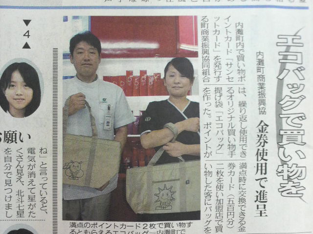 エコバッグの取材が来ました。サンセットカードの副理事長兼販促委員長だからです北国新聞さんがあまりに大きく扱ってくれてビックリあれ?でもでも取材された私は最後の一行だけ・・・・嫁さんがお手入れ中で手が離せないためバックを持ってもらった理事の花ともの紀州さんは大きく写真が載っていて親御さんや知り合いがビックリされたようです!今日は朝からエコバッグに興味を持って頂き何人かにお嫁に行きました。午後から中日新聞さんにも取材を頂きましたので明日以降の紙面も楽しみです。引き続きエコバックキャンペーン実施中です♪さてタカタ薬局ではオリンピック応援セールとして金メダル当てクイズ実施中日本の金メダルの数をピタリ当てた方には満点カード1枚進呈!参加者に100p差し上げます。同時開催エコバックプレゼントセールも大好評また金メダルが出た次の日はポイントが?倍!1個なら2倍、2個なら3倍、3個なら4倍!4個なら5倍!合言葉は頑張れ日本で差し上げます。数多くのドラマ期待してます!今日はソフト頑張って欲しいです!医者と薬は舵取り治すのは自分自身です!薬の力は3分の1、残りは自然治癒力、残りの3分の1は自分自身の考えなのです。人間の持つ自然治癒力をマックスに引き出してくれる世界一の薬レオピンシリーズをお奨めします!普段からの自然治癒力を高めるには健康に対する考え方そして予防と養生それが十分できないならレオピンが一番!長期愛用者ほどその恩恵に感謝されています。レオピンは天然のお薬、毎日飲んだ方が良い上薬でできています。安心して服用下さい♪疲れ、家族でお手軽にキョーレオピンワンランク上のレオピン、冷えや食欲不振があるならレオピンファイブもっと元気にいつまでも若々しくいたい方にお奨め!若返りのレオピンロイヤル特定検診メタボ対策できていますか?急いでダイエットしなきゃ!と言う方も多いのでは?そこでやっぱり頼りになるのはマイクロダイエット!キャンペーン中!こっそりお店で聞いてくださいねお気軽にお申し付け下さいませ!メークアドバイスします是非ご来店下さい。0120-38-6966タカタ薬局 薬剤師 高多健一石川県河北郡内灘町向陽台1-144本気で痩せたい人集合!タカタ薬局がマイクロダイエットと自分自身のー18kgダイエット経験から痩せるまで責任もって指導します!もっと健康になりたい方、キョーレオピン、レオピンファイブ、レオピンロイヤル、その他素晴らしい商品と予防と養生でお客さまを必ず健康に導きます!もっと綺麗になりたい方、資生堂最高級ブランド CPBシネルジック取り扱いドラックタカタが肌診断してお客さまに最適の商品とお手入れをご提案します!エステも1000円~お気軽にお電話下さい。0120-386966