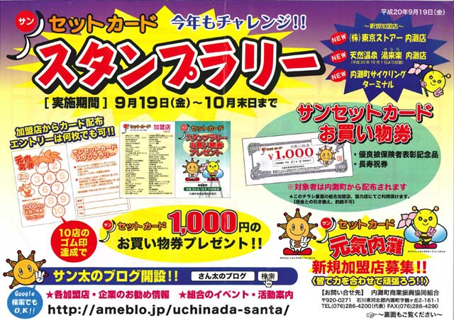 また北国新聞の取材がきました。以前紹介したさん太のブログの件です。商工会での取り組みを熱く語りました。今回は写真を撮られましたが、何と最初の写真はボツ何故かと言うと私男一人がPCに向ってる写真だったので寂しすぎるという事で女の人を2~3人とリクエスト何とか格好がつきました。今後は商工会のブログも利用していきたいと思います。”北國新聞を見た”または”ブログを見た”と言っていただくとポイントを5倍にしますとのことですので、ぜひお寄りください(9/8から9/11の4日間のみ)エコバックキャンペーンを継続しておりますサンセットカードの満点カード2枚使いお買い物をして頂くと何と保冷機能付きエコバックが先着1000名様にもれなくプレゼント!新聞に紹介されてからは大人気!!先日はお金を出して買いたいという申し出まで可愛いサン太君が表に最近エコバックらしき物はよくみかけますがこれは保冷機能付き!しかも四角くなり買い物カゴにセットできるので詰め替えする手間が省けます満点カードは通常どおりお買い物に使えます。このチャンスをお見逃し無く!医者と薬は舵取り治すのは自分自身です!薬の力は3分の1、残りは自然治癒力、残りの3分の1は自分自身の考えなのです。人間の持つ自然治癒力をマックスに引き出してくれる世界一の薬レオピンシリーズをお奨めします!普段からの自然治癒力を高めるには健康に対する考え方そして予防と養生それが十分できないならレオピンが一番!長期愛用者ほどその恩恵に感謝されています。レオピンは天然のお薬、毎日飲んだ方が良い上薬でできています。安心して服用下さい♪疲れ、家族でお手軽にキョーレオピンワンランク上のレオピン、冷えや食欲不振があるならレオピンファイブもっと元気にいつまでも若々しくいたい方にお奨め!若返りのレオピンロイヤル特定検診メタボ対策できていますか?急いでダイエットしなきゃ!と言う方も多いのでは?そこでやっぱり頼りになるのはマイクロダイエット!キャンペーン中!こっそりお店で聞いてくださいねお気軽にお申し付け下さいませ!メークアドバイスします是非ご来店下さい。0120-38-6966タカタ薬局 薬剤師 高多健一石川県河北郡内灘町向陽台1-144本気で痩せたい人集合!タカタ薬局がマイクロダイエットと自分自身のー18kgダイエット経験から痩せるまで責任もって指導します!もっと健康になりたい方、キョーレオピン、レオピンファイブ、レオピンロイヤル、その他素晴らしい商品と予防と養生でお客さまを必ず健康に導きます!もっと綺麗になりたい方、資生堂最高級ブランド CPBシネルジック取り扱いドラッグタカタが肌診断してお客さまに最適の商品とお手入れをご提案します!エステも1000円~お気軽にお電話下さい。0120-38696612万のクリームは無理でもシネルジックシリーズのお買い上げ毎にヴィタリテ ド ボーテは体感して頂けます。また12万のクリームは無理でもヴィタリテ ド ボーテ施術用の1万円のクレームシネルジック(3g)で体験できます。クレームシネルジック石川県内では当店とデパートの2件のみの取り扱いです。是非ご来店お待ちしています。