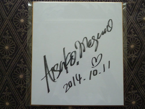 明日からの展示会に向け設営して来た 多摩の黒酢 です。明日から東京ビックサイト(国際展示場)で展示会があり、現場責任者として、デモセットを本日、設営して来ました。明日から3日間は足を棒にしてコンクリートの上に立ち、説明員です。先日、府中(東京競馬場)で、トークショーがありました。競馬関係でリポーターやキャスターをされていた目黒貴子(めぐろ あつこ)さんの直筆サインです。サインをいただくまで、「たかこ」さんだと勘違いしてました。福島県出身だったと思います。(競馬関係の女性記者やアナウンサーは東北出身が多いかも。。。)今住んでいるマンションの不動産会社が「目黒」で鍵を取りに行ったことを思い出しました。