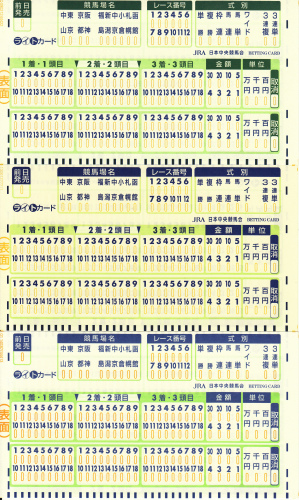 床屋へ行った 多摩の黒酢 です。単身赴任してからの方が、当ブログへのアクセス数が増えてます。不定期更新ですし、皆様にご心配をおかけしていると感じております。仕事と家事の両立は、本当に大変ですね。洗濯中に自宅で仕事をしていたら、仕事に集中し過ぎて干すのを忘れ、Yシャツ(カッターシャツ)が半乾きでシワシワになってしまいました。洗濯機も、もう少ししつこく「終了しましたアラーム」を鳴らして欲しいです。まとめて、アイロンだな。。。個人的に洗濯は好きな方です。 風呂の残り湯を使うので、エコ的な達成感があります。さて、今週末は菊花賞(G1)。身を清める意味でも、気持ちを切り替える意味でも、床屋へ行きました。転勤する前、ギリギリに床屋へ行こうと思ってましたが、移動前の1週間は忙し過ぎて、タイミングを逸してしまい、東京転勤してから約1ヶ月経って、床屋へ行きましたので、結局、約2ヶ月ぶりの床屋になってしまいました。そう言えば、JRAのマークシートの「ライトカード」の色が変わりましたよね。緑色が青っぽくなりました。東京(関東)だけってことはないと思いますが。。。見やすくなったと思います。逆に、今頃ですが、JRAのHPは見にくくなったと思います。追記:10/25 20:10関西(京都競馬場)のライトカードですが、緑色から青色には変わってましたが、東京競馬場の青よりは「薄い青色」でした。上:旧ライトカード(緑色)中:東京競馬場のライトカード(青色)下:京都競馬場のライトカード(薄い青色)