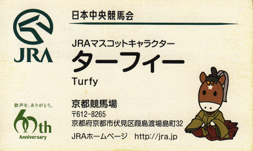 マンションのWi-Fi環境が開通した 多摩の黒酢 です。タブレットを1台導入しました。タブレットでのブログ記入は、かなり大変なので、当面、不定期更新となります。それとスマホの電池消耗が減りました。3Gよりは、Wi-Fiルーターが室内にありますので、通信に使う電力を軽減出来ます。JR品川駅では、タブレットを無線で使用出来ましたが、他の場所でアクセスポイントがある所を探してみたいと思います。京都競馬場のステーションゲートでターフィーを見つけましたので、名刺を入手しました。これで、「阪神」「東京」「京都」のターフィー名刺を入手出来ました。今年はJRA60周年ですので、この名刺も来年はまた違うバージョンが出るのでしょう。