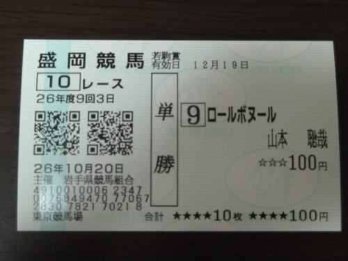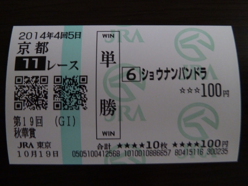 阪神タイガースが日本シリーズ出場になりました 多摩の黒酢 です。大阪にいないので、現地の様子がよくわかりませんが、きっと道頓堀川に、たくさんの人が飛び込んでいると思います。セリーグ2位の阪神が日本シリーズ出場なので、それまでの130試合と巨人のセリーグ制覇の意味がよくわかりませんけど。ビートたけし氏が言ってましたが、「あれじゃ、戎橋からの飛込みは止められない。警察が道頓堀川の中に入って埋め尽くすか、槍で突くようにしないと・・・。」さて、秋華賞(G1)も単勝1倍台のオークス馬のヌーヴォレコルトが敗れました。負けて強しの内容でしたが、勝ったショウナンパンドラに騎乗した浜中騎手が上手く乗りましたね。[記念単勝馬券/的中・非ご当地発券(JRA東京競馬場)]単身赴任で、東京から地元・京都競馬場のG1レースをテレビで見るのは非常に複雑な気持ちです。そして、東京競馬場のメインレースは、1番人気馬・エイシンヒカリが大逃げして勝ちました。大ケヤキのあたりのレースぶりは、サイレンススズカを思い出しました。デビュー以来、5戦5勝で、遅れて来た怪物かもしれません。芦毛のディープインパクト産駒で、非常に面白いと思います。[記念単勝馬券/的中・ご当地発券(JRA東京競馬場)]