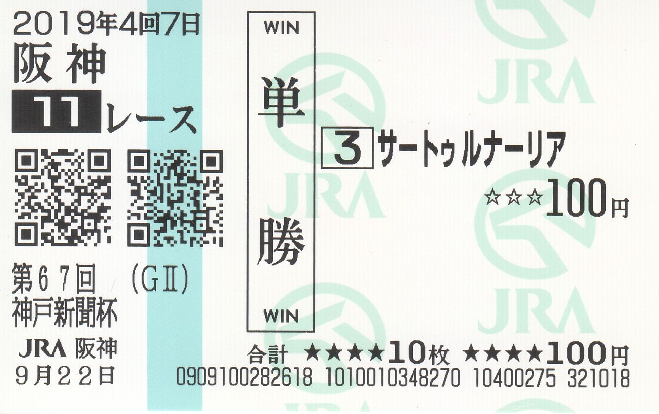 台風の雨が降って来る前に仁川から退散した。 の 多摩の黒酢 です。菊花賞トライアルの神戸新聞杯(G2)は、C.ルメール騎手騎乗のサートゥルナーリアが楽勝でした。私の待つ、淀(京都競馬場)の菊花賞(G1)へ出走して欲しいですね。【記念単勝馬券(ご当地発券)】ルメール騎手に、もう1頭のお手馬・アーモンドアイのクリアファイルにサインをいただきました。