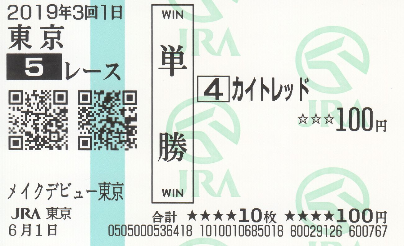 JRA(日本中央競馬会)も『65周年』らしいですね。 の 多摩の黒酢 です。今年の日本ダービーが第86回でしたので、65周年というのは、JRA(日本中央競馬会)になってからということですね。私は、JRA50周年や60周年を経験しているので、65周年というのは、何だか中途半端な感じがしてます。JRAの売上もピーク時の7割程度まで落ち込んでいると聞きました。無理矢理65周年も「アニバーサリー」にしてイベント化しないとならないということでしょう。もしかしたら、毎年、JRAの創業日はアニバーサリー化しそうですね。さて、猛虎魂さん(東京都在住)からの頂き物のJRA編です。未来のJRAを支えるかもしれない2歳馬たちの新馬戦の馬券です。