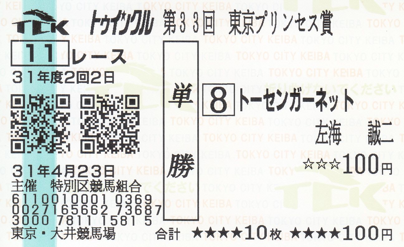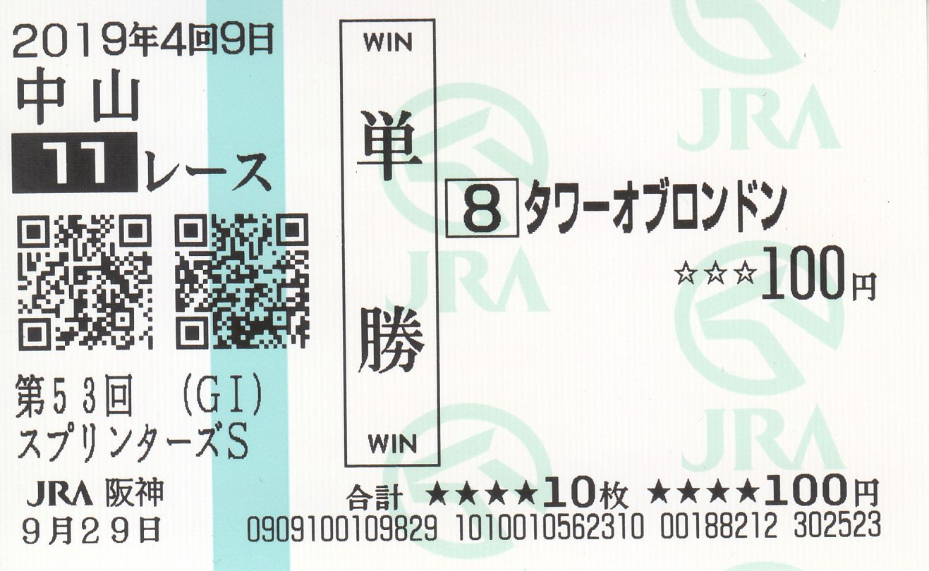 『多摩の黒酢が、某競馬番組(12月放送)に出る。』ってよ。 の 多摩の黒酢 です。「公人ではなく、私人(詩人)ですので。」と1度はお断りをしたのですが、「折角の機会ですし、後ろ姿だけで顔は映しませんので。」とスタッフの方が言うので、某CSの競馬番組KTに出演することになりました。KTは、馬券プロの皆様の出演する番組なので、素人が映って大丈夫かと思いますが。。。まぁ、地上波での放送は無いので、気が付いた方だけ、見て下さい。さて、2019年秋のG1開幕ですが、ラクビーの母国・英国にちなんだタワーオブロンドンが勝ちました。【記念単勝馬券】そして、「誕生日馬券」が獲れたぞー。 三連複で10.7倍ですが。。。そう言えば、WINS佐賀が無くなりました。 九州在住時は、お世話になりました。おそらく、私がWINS佐賀で購入した最後の馬券かなと思います。