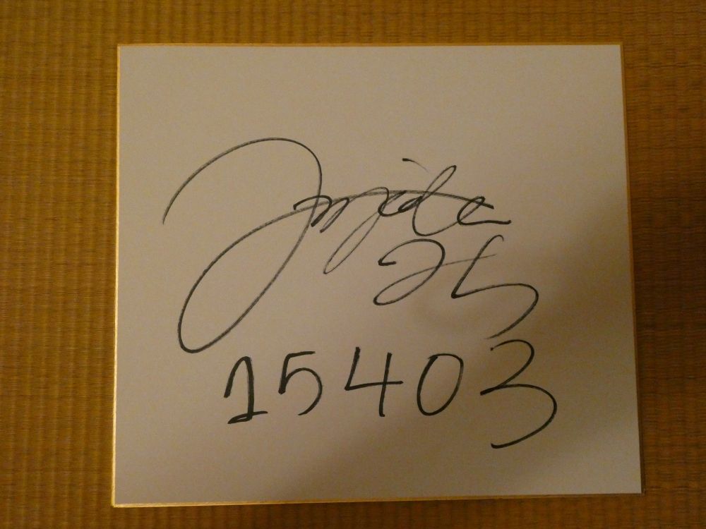 珍しい名前の方ですよね。 の 多摩の黒酢 です。私の苗字は、『ジャパニーズ・ビッグネーム』なので、珍しい苗字の方は、ちょっとだけ興味があります。佛圓万里菜(ぶつえん まりな)さんと立ち話で、「珍しいお名前ですよね。」と話すと、「そうなんですよ、よく言われます。」「でも、1度覚えていただくと、忘れないようです。」 と話されてました。この日は、アシスタントでしたが、競馬1年目で競馬界の重鎮がたのお相手は、緊張するかもしれませんね。宮川一朗太さんからは「ぶっちゃん」というニックネームで呼ばれてました。サイン色紙:サインは、難しい漢字でなくて、読みやすいです。