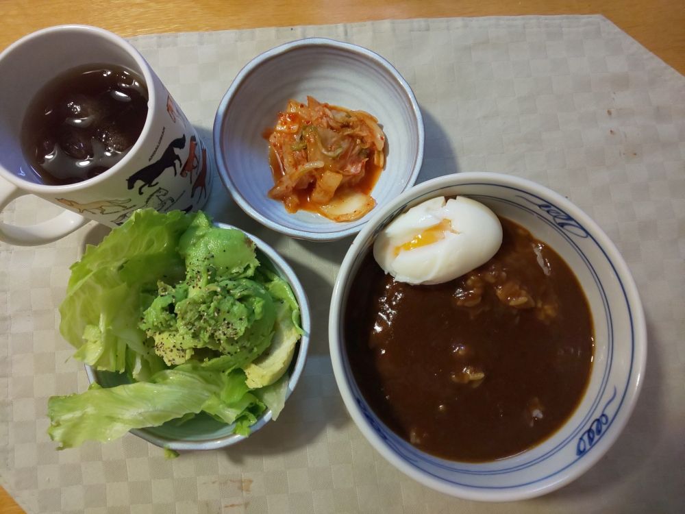 大阪は微妙に曇っていて、お月さんは見えてません の 多摩の黒酢 です。妻が仕事のため、夕食はレトルトカレーにしました。カレー丼って、大好きです。「アボカドのサラダ」と「キムチ」も美味しかったです。
