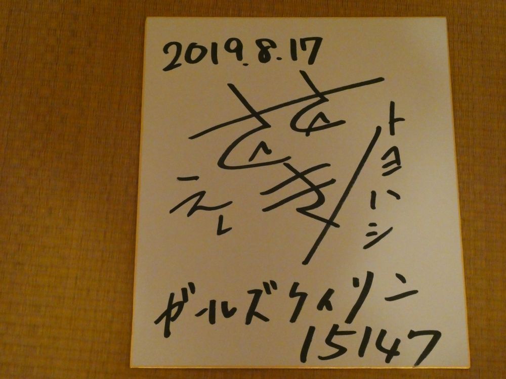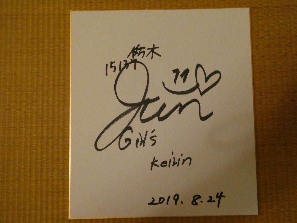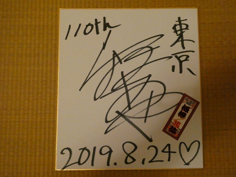 昨日、その金ナイターに行きました。 の 多摩の黒酢 です。ラクビー、アイルランドに歴史的な勝利に感動しました。大金星ですね。全て、想像ですが。。。SKNフラッシュ8のリーダー・佐藤夢さんも、おそらく拍手だと思います。おそらく、歴史的な勝利に笑顔だと思います。ちょっとだけ、今朝最終回・朝ドラ「あおぞら」の広瀬すずを意識したと思います。サイン色紙: