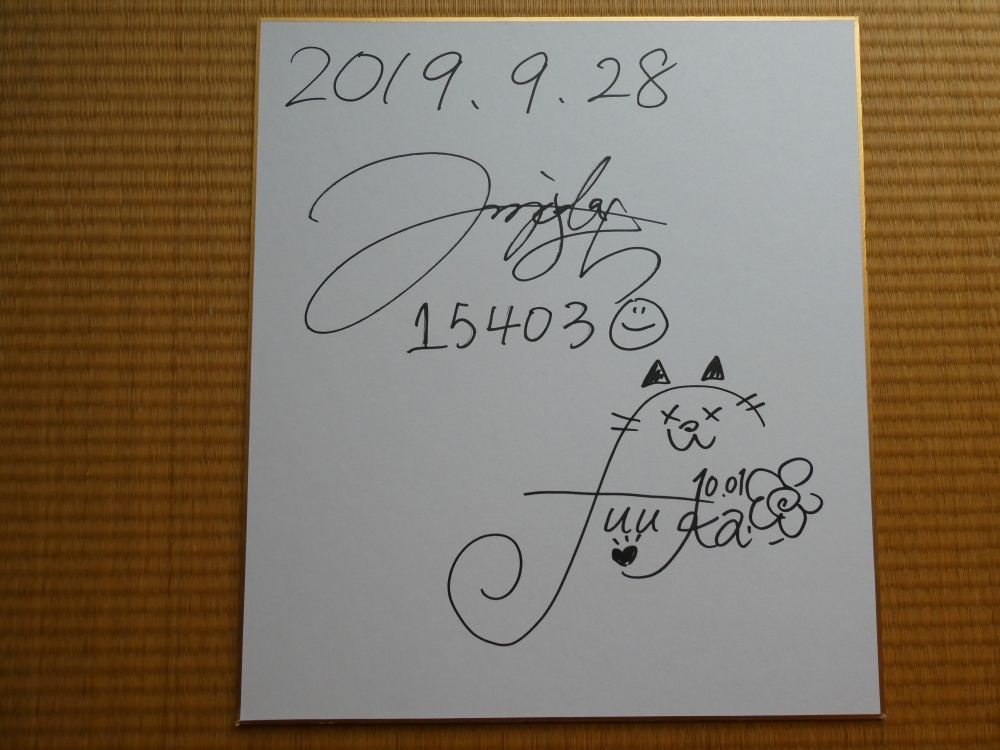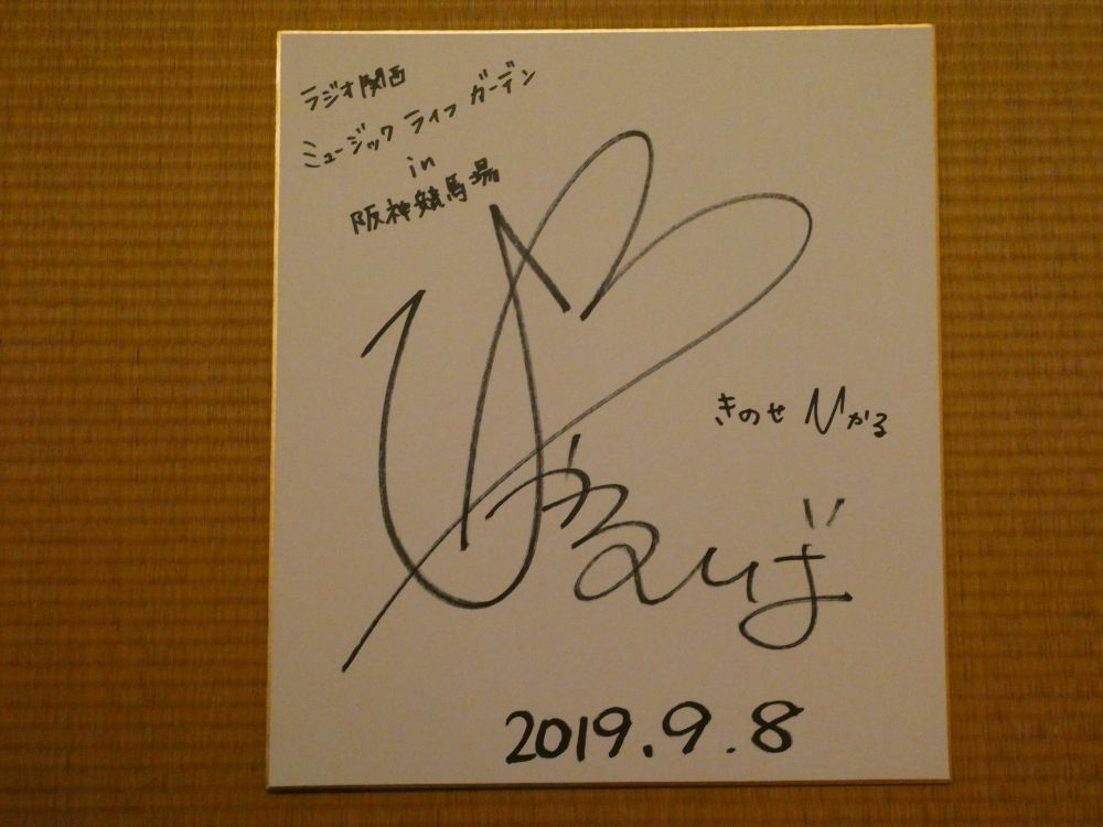 調べたら、たまたま誕生日が同じでした の 多摩の黒酢 です。さぁ、9月の三連休第1弾ですね。9/16(祝)は、JRAアニバーサリーで、阪神競馬場へ行く予定です。9/8(日)に、その阪神競馬場で、ラジオ関西のイベントで、歌手・矢井田瞳(yaiko)さんのトークショーがありました。その前座で、シンガーソングライター・HARUKAさんが歌ってました。北海道出身らしく、北海道は気温が25℃くらいだったそうですが、この日の阪神は35℃くらいありました。アコースティックギターも上手かったですが、歌声が素敵でした。10月に1stアルバムが出るそうです。写真は撮影できなかったので、ネットから拝借しました。家に帰ってから調べたら、年齢は全く異なりますが、誕生日が一緒でした。サイン色紙: