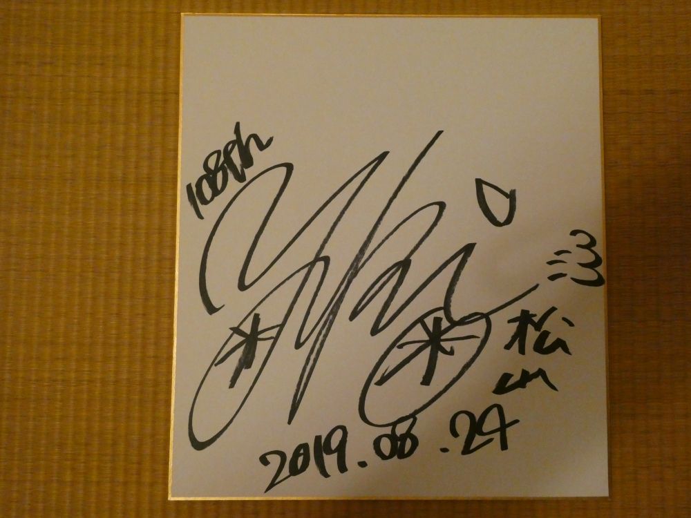 新作のクリアファイルへサインをいただきました の 多摩の黒酢 です。石神深一騎手(オジュウチョウサン主戦騎手)が勝利した場面に、阪神競馬場で出くわしましたので、たまたま所有していた新作のクリアファイル(オジュウチョウサン)にサインをいただきました。 ラッキーでした。九州(単身赴任)から関西(自宅)へ戻って来て、(個人的に)初日の秋競馬でしたので、非常に良いスタートをきることが出来ました。 九州では、条件的にとても無理でした。追記(9/12 21:25) サイン色紙の画像を追記します。