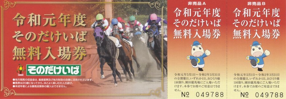 消費税増税に向けて、そろそろ6ヶ月定期券を購入 の 多摩の黒酢 です。JR西では、定期券は2週間前から購入可能とのこと。10/1からの消費税増税に向けて、10/1から定期券代も上がりますが、9/30までに購入した6ヶ月定期券は有効とのこと。増税後にいくらUPするのか、調べると6ヶ月定期券で460円UPでした。ちなみに、自宅最寄り駅から会社最寄り駅まで、2駅です。切符購入の場合、現在180円(片道分)ですが、増税後も180円のまま。(183円になりますが、JR西の場合は、1桁目は四捨五入のため、切り捨て)一見、値上げにならない切符の方が、値上げになる定期券よりお得に感じますが、JRの定期券は割引額が大きい(1ヶ月定期券で、14.38日分)ので、明らかに定期券購入がお得です。猛虎魂さん(東京都在住)から、またまた競馬グッズをいただきました。いつもありがとうございます。いただいた(関西では入手困難な)南関競馬の記念単勝馬券を時系列に掲載します。時系列で掲載するほど、たくさん頂きました。単身赴任終了が決定していなかった4/23の馬券です。(まだ、平成31年です。)単身赴任終了に向けて、会社と人事面談を受けていた頃の馬券です。(令和元年になりました。)令和最初の「結婚記念日」の日の馬券です。すでに異動が決まってましたので、ちょうど、引っ越し業者と打ち合わせしていた頃です。6/25に単身赴任先社宅から荷物搬出し、6/26に大阪(自宅)へ荷物搬入でした。7/1付けで現職場へ出社しましたので、少し落ち着いた頃の馬券になります。