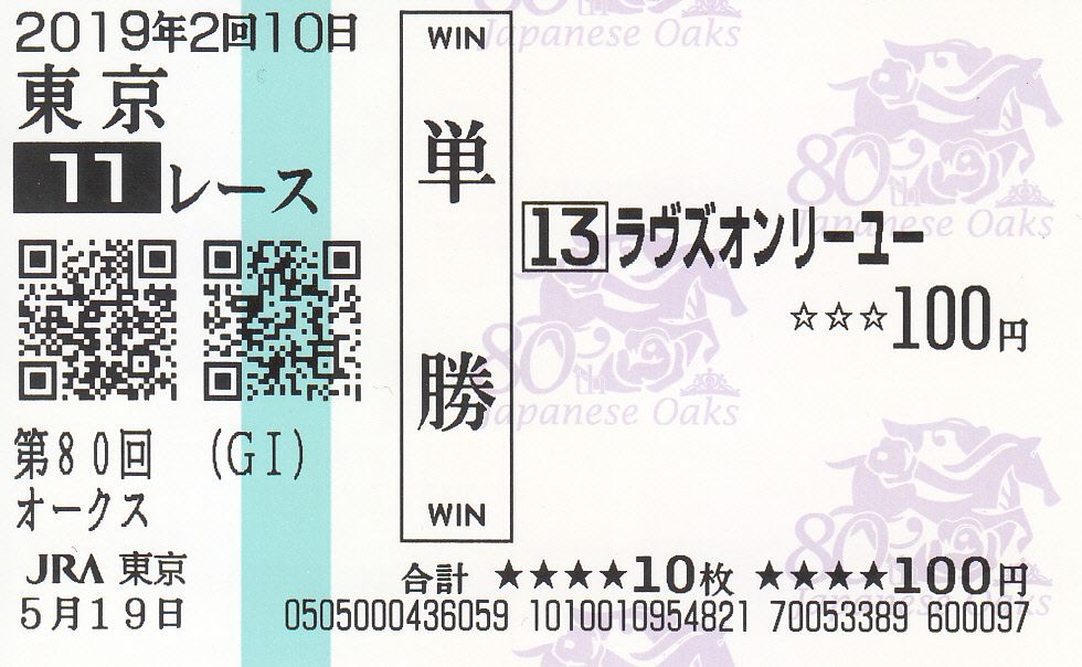 オークスの馬券(絵柄が80回記念の特殊仕様):