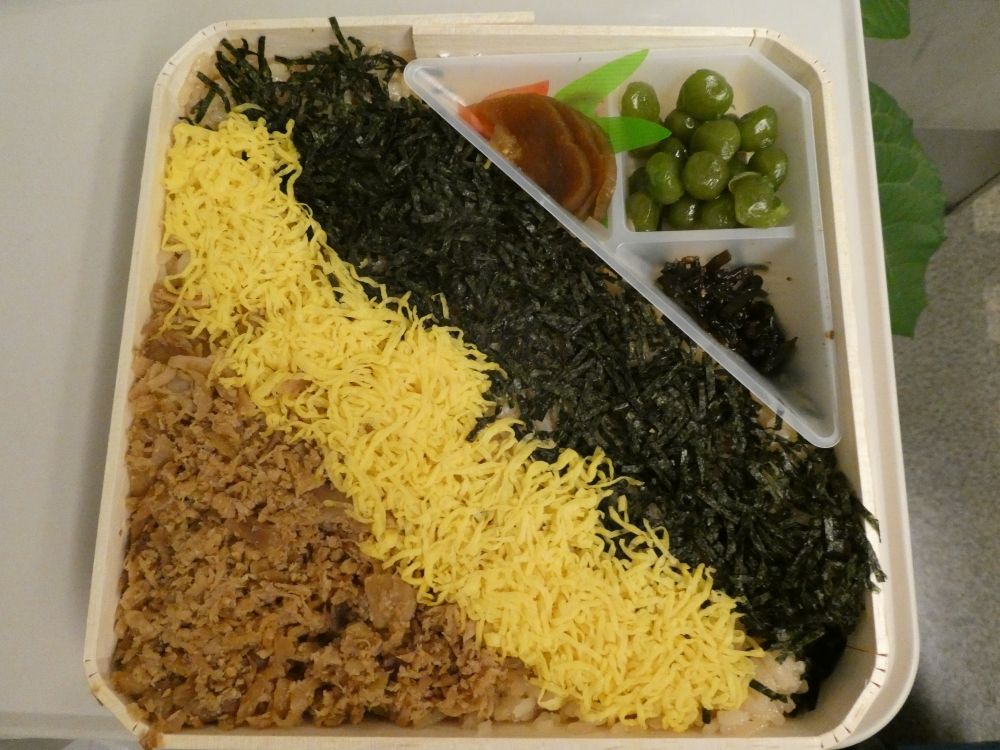 3色そぼろの下のあっさり味の「かしわめし」が絶品です。ぺろり