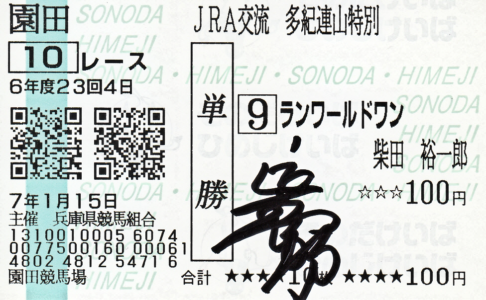 YJSトライアルラウンド園田 の第1戦で勝利した 柴田裕一郎 騎手(JRA)からサインをいただきました。 直筆サイン色紙: 直筆サイン入り馬券: