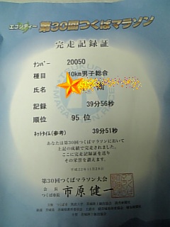 大田原マラソン以降3日ほど放牧期間を得て、本日☆つくばマラソンへ参戦まだ右ハムに若干筋肉痛が残っていたけど、10キロは走れるだろうと、あまり気にせず。今回は仲間の応援がメインだから(笑)午前9時半にフルのスタート・・晴天に恵まれ気温は少々高めかな!?フルへ参加された皆様・・自分の走りをしっかりとしてきてください!!と心に思いつつフルのランナーさんを見送るクラブの仲間や知り合いの顔を見かけて手を振り ながら『いってらっしゃ~い』って見届け・・40分後の10時10分に10キロのスタート。フルのランナーの数からするとかなり少ない。AブロックでSJコーチと遭遇し、しばし談笑。『その日の一生懸命な走りができればOK』だよって・・SJコーチ俺も・・SJコーチと同じだよ。キロ4分少し切れる辺りで走ると言いつつ、俺より5分以上速いし(苦笑)また・・一緒に走れる大会があったらお願いします。で・・・・巻き戻し???俺はAブロックからのスタートでしたのでタイムロスなくスタート入りの1キロと言うか最初の1キロポイントを見落とし、どの位かわからなかったけど、知り合いランナーさんをストーカー2キロポイントでLap確認・・7分34秒。。余裕度は??3キロポイント・・11分32秒。。なんか☆きついし・・知り合いランナーさんからジリジリと離され始めている。脚の動きもよりも心肺的に苦しい!?余裕なし・・4キロで折り返し仲間(コーチやそのチームメイト)の応援で力を貰う。5キロ通過・・19分50秒。。やはり落ちてる40分切りも『黄色信号』点滅ですなんでこんなに苦しいんや??第二折り返しまで後続ランナーに抜かれ始めたけど、なんとか今の自分のできる最低限の走りで粘る。折り返してからラスト3キロでチームメイト(往路)からの応援を戴き、自分の脚へ鞭へ入れる。だって・・同じ10キロを必死に走っている仲間からエールをもらっては・・それも俺より後方なのに(感謝) ラスト2キロで32分ジャストだったので、キロ4分を切れる走りができれば40分は切れると頑張る。自分のなかで最低限40分切りと考えていたのでで・・結果は辛うじて40分は切れました2010年ラストーレースでなんとか最低限の目標をクリアーできたので、よしとしておきましょう。途中☆仲間の応援をいただけたからかなぁ。。 この後はフルのお仲間の応援皆様の頑張りを目の当たりにして、とても元気を貰えました!!ありがとうございましたm(__)m元気を戴けたので・・来月から目標レースに向け、トレーニング再開です課題も自分なりにわかっているので、まずはその課題をクリアーしていかないとね。。それでは・・つくばへ参加された皆様お疲れ様でした 追伸::本人はいたって元気??を装いつつ酔っ払いブログ!?誤字☆脱字等あるかもしれませんが・・お許しください