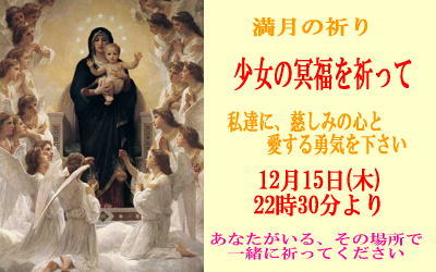 私達は、これ以上、悲しい犠牲者を出したくありません。冥福を祈るのは、2人の少女の予定でしたが、3人になってしまいました・・・・皆さんお願いです。少しでも早く、そして少しでも強く、慈しみの心と愛する勇気が、私達の世界に広がるように、お力を貸してください。本当のことを言うと、今度の祈りの会には200人以上の人が、同時に祈りを捧げて欲しいのです。そのくらいの人数が集まると、とても大きなエネルギーが動き始めます。皆さん、お願いです。満月の祈りのメッセージを、皆さんのブログに貼り付けてもらえませんか。たった1日で結構です。多くの人たちの目に留まるように、そして、共に祈りを捧げてくださる方が、増えるように。皆さんの良心に、心からお願い申し上げます。