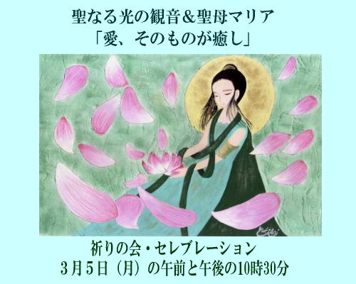 聖母マリア&聖なる光の観音様プチカン・プチマリ卒業祝い(セレブレーション)「愛、そのもが癒し」プチマリ&プチカンの卒業生の皆さん、ご卒業おめでとうございます皆さんは、今、自分の人生のコントロールキーを手に入れました。あなた方1人1人が、この宇宙から限りなく愛され、慈しまれている存在である事に気付いてください。あなた方1人1人が、この地球と宇宙にとって、限りない宝物です。そして、この地球と宇宙を、導く希望の星です。あなたのハートを、どうかオープンにしてください。私達宇宙の意識からの、ギフトを受け取るご準備をしてください。私達は、あなたの心の内側に眠る可能性を信じています。そして、今この時を、祝いましょう。祈りの言葉「この宇宙に、満ちるマリア様の意識よ、観音様の意識よ。私の心と深く繋がってください。私の心に愛の光と癒しの光を満たしてください。私は自らの魂の定めに従い、自分自身を祝います。」祈りの会は、5日朝の10時30分と夜の10時30分に行われますが、あなたの都合の良い時間に都合の良い場所で、祈りの言葉を捧げてください。そして、あなたの心の中に、マリア様と観音様を導いてください。勿論コメントもお忘れなくお願いします。プチマリプチカンの卒業生だけでなく、どなたでもご参加できます。今回はKISAさんのイラストから「マリア観音」をご紹介いたします