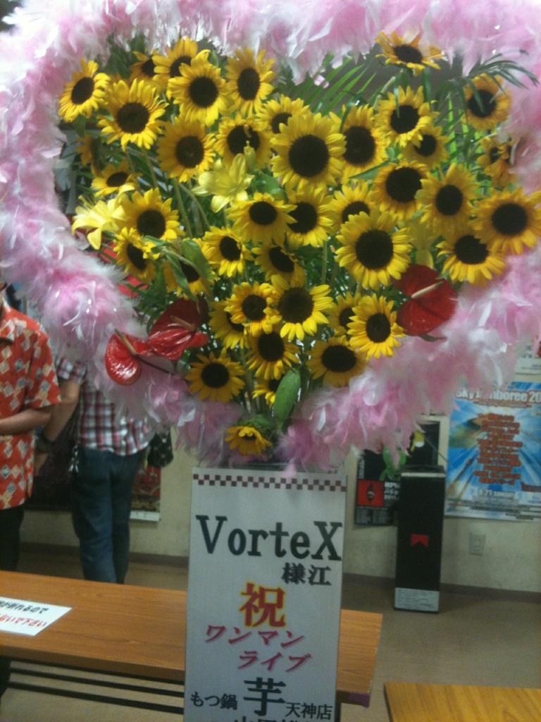 コメントへの返事を書き終えてないのに更新m(_ _)mすみませんm(_ _)m昨夜はkozwaとVorteXさんのライブを観て今夜は、ついさっきまでうちでkozwaと打ち合わせをしてましたくーるさんに返事を書いて大切な皆様に書かないわけにはいかないので必ず、明日あたりには書きますその昨夜のVorteXさんのワンマンライブですがとても素晴らしく、いい勉強になりましたホント、あっという間に感じて・・終わった後も、もっと観たい~~~って思ってました。。オープニングからアンコールまで全く飽きさせない素晴らしいパフォーマンスで1週間後に向けて、いい刺激になりましたそれと・・ひとつですね・・これは、やられた・・と、思ったことが・・それは、ライブが始まる全然前・・開場してすぐのことでした。。kozwaと一緒に入口に行き・・2、3歩先を行くkozwaが・・「あっ・・」直後に、入口を見た僕が・・「うわっ・・」約3秒ほどの沈黙の後、二人で・・「これ、欲しいね・・」ビートステーション入口で僕達の目に飛び込んできたものが・・これなんです向日葵の花輪とは・・いや~~~、これにはやられた・・これってさッ[4日のビートステーション]じゃなくて[11日のハートビート]の間違いじゃないのぉ~~・・って言いたくなるほどに・・いや~~、こりゃ、やられましたね正直、かなり羨ましかったですまわりのピンクのハートは僕達には似合わないですが・・向日葵の花輪は11日のハートビートにめっちゃ、似合うのになぁ・・。