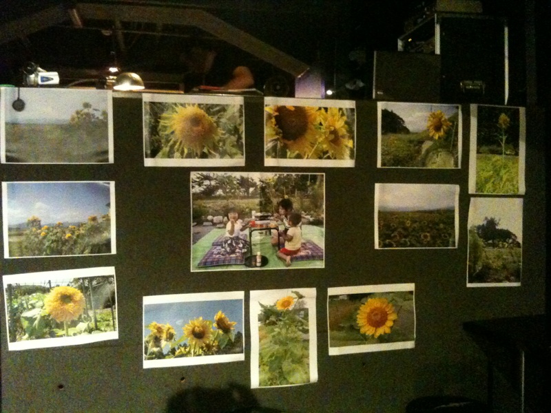 昨日の続きになります。父子さま、肩車で「行くぜッ」の扉を開けハートビート店内へ。。向日葵画像を貼りつけるにはある程度、枚数を予想して壁の縦横の寸法もはかり一枚一枚、プリントするサイズも決めなきゃいけなかったので事前にハートビート店内の形を手帳に書き込んでました。下手な図ですが・・どこかに貼ってあるか少しでもわかってもらえるように載せておきますね。。あ・・、数字は気にしないで。。写真の大きさや、枚数を計算するのに僕がわかるように書き込んだだけなので。では、店内に入り左側の壁に。。店内で撮ったものは暗くてすみません。。写真の左が後ろ、右が前になります。。この右側も、撮ってきたのですが僕が撮ったのは暗すぎてわからない・・なので当日、ライブを観に来て頂いた方が撮影してくれたものをお借りして・・撮影してくれたのは、なんとブロ友様SUKOYAKASAMYさんです。大牟田から、観に来て頂きました。向日葵画像も、僕が行った場所と同じ柳川ひまわり園の写真を提供して下さいました。さらに、その右には、柱が少し出ていてでっぱりの部分にも貼ってます。エリリン姫☆彡さんは沢山の写真をアップしてくれただけでなくご自身のブロ友さんにも、声をかけて頂き画像集めに大きく貢献してくれました。柱には、さらに大きく引き伸ばした子供達の写真を貼りました。左側の柱はkozwaの子供達ですさらに、その右、一番前ステージに近い少しのスペースには数少ない、どアップ画像を貼りました。ここで右を向くと、ステージです。ステージには本物の向日葵2本です今度は反対に、ここから右を向いて右側の一番前左右同じようにこっちも、どアップ画像ですさらに右へいくと、柱がありこっちには、もちろん僕の子供達さらに右へ。。上海からは、向日葵で顔を隠してますがDY28さんが本人登場画像を提供してくれましたflamenco22さんはご自宅付近で、向日葵が見つからないため鹿児島の友人さんに送ってもらった画像をブログにアップしてくれました。さらに、右に行き、右最後方・・。会場作りやCD販売を手伝った長女、真白がちゃっかり写ってます柊2111さんはお子様の幼稚園の向日葵やご自宅の庭に咲いたミニ向日葵を提供してくれました。右に写ってる柵には造花を掛けてますkotona♪さんは会場を飾るための造花と本物そっくりの造花の向日葵の花束を送ってくれました。その他にもhimawari2174さん、spring85さんsakuranbonokiさん、ねこすみれさんcr i stmasrozeさん、masatosdjさん◎あり◎さん、ちあべいさん、・・など9人の楽天ブロガーさんが画像を提供して下さいました。また、向日葵が周りに見つからなくて画像提供できなくても・・僕が訪問に行けなくても・・いつも、コメントを入れて下さってたブロ友さん達の言葉はとても心強く、励みになりました。。ブログ仲間様と共にッ作り上げたライブになったと思いますそして、そして・・・。会場の、向日葵画像紹介も最後になりますが・・・やっぱりこの方を忘れてはいけない。。多くを語る必要もないと思います。会場作りの、僕の勝手なこだわりでした。客席の一番後ろ、PA席の下・・ステージと向かい合わせになる壁一面にゴロ助っ♪さん特集です