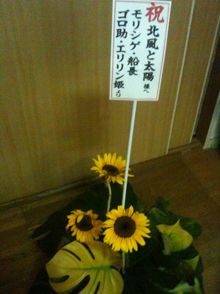 北風と太陽ワンマンライブから一週間が経ちました。。前記事のkozwa作詞/作曲の届けひまわりの歌は二部構成ライブの、一部の2曲目でした静かなピアノのBGMに合わせ・・向日葵と子供達の写真やステージにある二本の向日葵にスポットライトを当てていくオープニングBGMが盛り上がるとこで白い照明がバーンとそこで僕達がステージへ。。BGMがやみ・・・「ようこそ」のkozwaの一言から1曲目【HEART BEAT】皆様の笑顔の力強い手拍子演奏を終え、あたたかい拍手。。最初のご挨拶のMCへ・・・と、・・そこまでは・・イメージ出来てたのですが・・。その次に歌うのに・・相応しい歌がないなぁ~~と。。そこでkozwaが、作るということになり・・作ってきた歌でございました。。初作曲作品、初披露となるわけでスタジオ練習も、この歌に費やす時間が半分以上だったと思います。。何度も何度も練習して・・途中、かなり迷ってるkozwaでした。。ライブまで一週間を切った頃に「この歌、セットリストから外そうか・・」みたいなこと言い出したりも。。でも、やっぱり、やってよかったですねあのライブの、2曲目に相応しい歌だったと僕も思いますさて、あれから一週間が経ちましたがあの日、素敵な仲間達から届いたひまわりのアレンジメント全部で30本ありましたがそのうち、まだ3本が咲いてるんですよ届けひまわりの歌