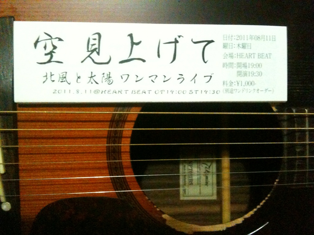 あれこれやってみた第一部を終えこちらのブログも、風邪をひいたこととかプールでのたけたけ水着姿披露とかちょいと休憩を挟み・・実際の会場は、音楽仲間様のBGMを流し約20分程の休憩を挟み・・再び、会場は暗転へ。。第二部の始まりです。。このワンマンライブも、元々は2月に参加したバンドバトルにて審査員特別賞として頂いたものバンドバトル決勝を観て下さった方も多数来られることもあり・・あの時をちょっとふり返り・・第二部のスタートは・・・バンドバトル決勝と全く同じ、オープニングから三曲をたて続けにやりました。オープニング[ディパーチャー]1曲目[汚れなき空を子供達に]2曲目[少年犯罪]3曲目[秋の風吹かれて]参考動画としてこちらを2011.2.13【バンドバトル決勝】北風と太陽ヒットメドレーか・・ってぐらいの勢いでドンドンドンとやってみました1曲1曲に大きな拍手感謝、感謝、感謝ですそして、ちょっとMC。。結成した当時のことを話し・・4年前の5月25日の初ライブで最初にステージで歌った曲へ。。つまり北風と太陽のスタートであり原点とも言っていい、歌を久しぶりに・・4曲目[足跡]懐かしく思った方も、初めての方も前奏から笑顔で手拍子後ろの方では踊ってる方も見えました演奏を終え、拍手が鳴り止み・・静かにMC。。ワンマンライブの機会を与えて下さったハートビートのスタッフの方々へお礼の言葉を述べ・・そして・・「では、最後の1曲です」と。。客席からは・・・「え~~~~~~~~」へへっ狙い通りッま、一部の時間からすると二部は、あっという間に感じたでしょう。というわけで・・ついに最後の一曲の時が来たわけです。。二部の締めくくり、ライブの最後は・・当然、この歌なのですが・・北風と太陽の二人は意外と悩んだんですよ。。2つの候補のうち・・どっちをラストにするか・・んで、最終的にやっぱりラストに選んだのは・・・明日の更新であきらかに~~~というわけでですね・・最後の一曲に行く前に・・・実は、その前に歌った[足跡]4年前の初ライブで、最初に歌った僕達の原点みたいなもので。。今回、その[足跡]をYouTubeに初めて載せましたので今日はそちらをご覧下さい2011.8.11ライブ~空 見上げて~より 【足跡】幼い頃 見てた 夜空にはもっと 星が たくさん あった幼い頃 見てた 青空はこんなに 狭く こんなに 四角く なかったちっぽけな 島国に 生まれちっぽけな 身体のままちっぽけな ハーモニカを 吹いてちっぽけな ピックを 握り6つの 糸を かき鳴らしてどでかい 夢を 描いてきたこの 星の この 大地に僕の 足跡 残してやるそして いつか この命 終わる その時僕は 何を思い 誰が 傍にいてくれるんだろうちっぽけな 島国に 生まれちっぽけな 身体のままちっぽけな ハーモニカを 吹いてちっぽけな ピックを 握り6つの 糸を かき鳴らしてどでかい 夢を 描いてきたこの 星の この 大地に僕の 足跡 残してやる
