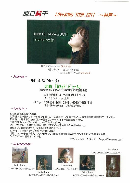 今週の金曜日神戸に行くため新幹線往復チケットを買いました~~高速バスだと、お安くすんだのですが考えに、考えて・・・8時間近くもバスに座ってることが・・ちょっと疲れそうだなぁ~・・とせっかく、ゆったりふら~~っと遠出でもなんて思ってたのにそれじゃ、ゆったり出来そうになく思い切って大奮発して行きも帰りものぞみに乗りますさてさて、神戸に行く目的は・・・コチラでございます原口純子さんのライブそのオープニングアクトを飾るのが上海でライブ活動中、ブロ友様でもあるDY28ことモリシゲさんです僕自身、先月、大きなライブを終え9月いっぱいまではライブお休みだなと。。ちょっと、ふら~っとどっか行こうかなぁ・・よし一人で車運転して鹿児島でも行ってくるか~~などと、思ってたところにモリシゲさんが神戸で歌うとブログに書いてらっしゃって・・ん・・9月23日か・・。三連休の初日だなぁ~・・。そりゃ、鹿児島に車で行くよりはお金はかかるけど、行けないことないよなぁ。というわけで神戸へ行こう~~になりましたまぁ、ぶっちゃけ、新幹線往復で25500円かかっちゃいましたが大ベテランのお二方のライブはいい勉強になると思うし他にも何人かのブロ友様とリアル出会いもありそうでッ金額以上に楽しんで来ようと思いますそして昨日は、さらにもう一人CD『空 見上げて』をブログに載せて下さってる方が大阪の船長88さんです。その船長88さんとも神戸でお会いすることになりそうです【君のままで】モリシゲ