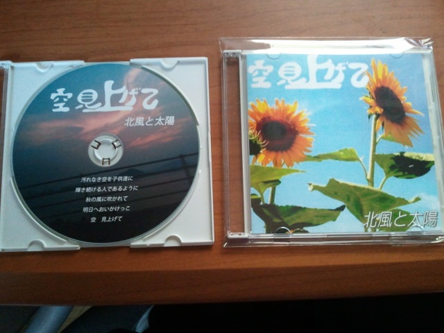 さてさて、ライブ報告もアンコールを残すだけとなりましたが・・近日中に、アンコールの映像もYouTubeにアップされる予定なのでもうちょい待ってね・・昨日エリリン姫さんのフィナーレ夕焼け祭りは最高でしたそこに提供させて頂いたたけたけ撮影不死鳥の夕焼けですが・・北風と太陽最新CD空 見上げてのCDラベルになってます因みに・・ジャケットの向日葵もたけたけ撮影だよ5曲入り、一枚500円だ基本的には、ライブ会場にて手売りしかしませんが・・もし、購入ご希望の方がいらっしゃったら私書箱へメッセージをすぐに返事をかえします。。